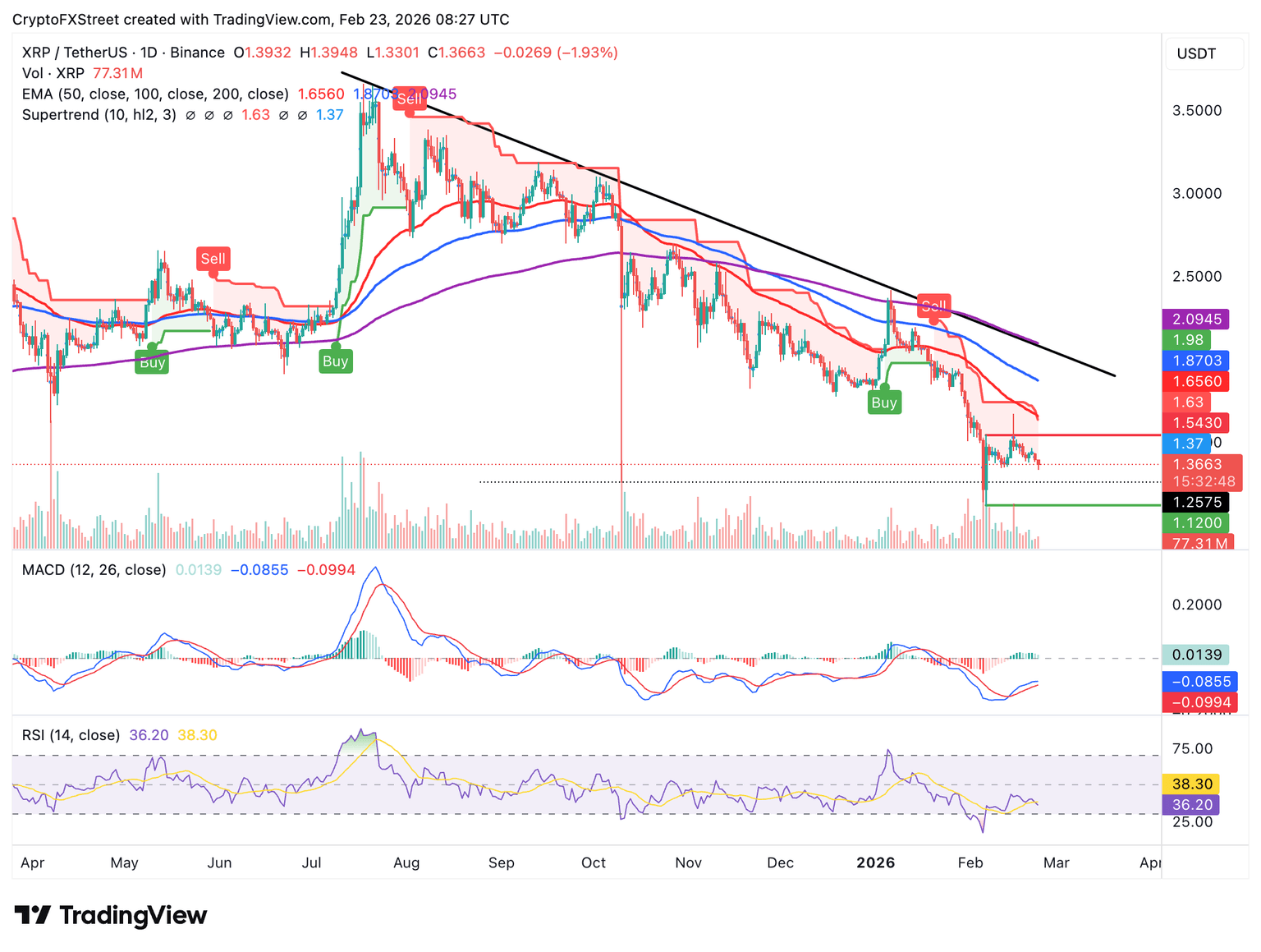 Al mismo tiempo, el RSI en 36 en el gráfico diario sugiere que el impulso bajista se está acumulando, lo que probablemente acelerará la caída de XRP hasta el mínimo del 10 de octubre de 1.25$.