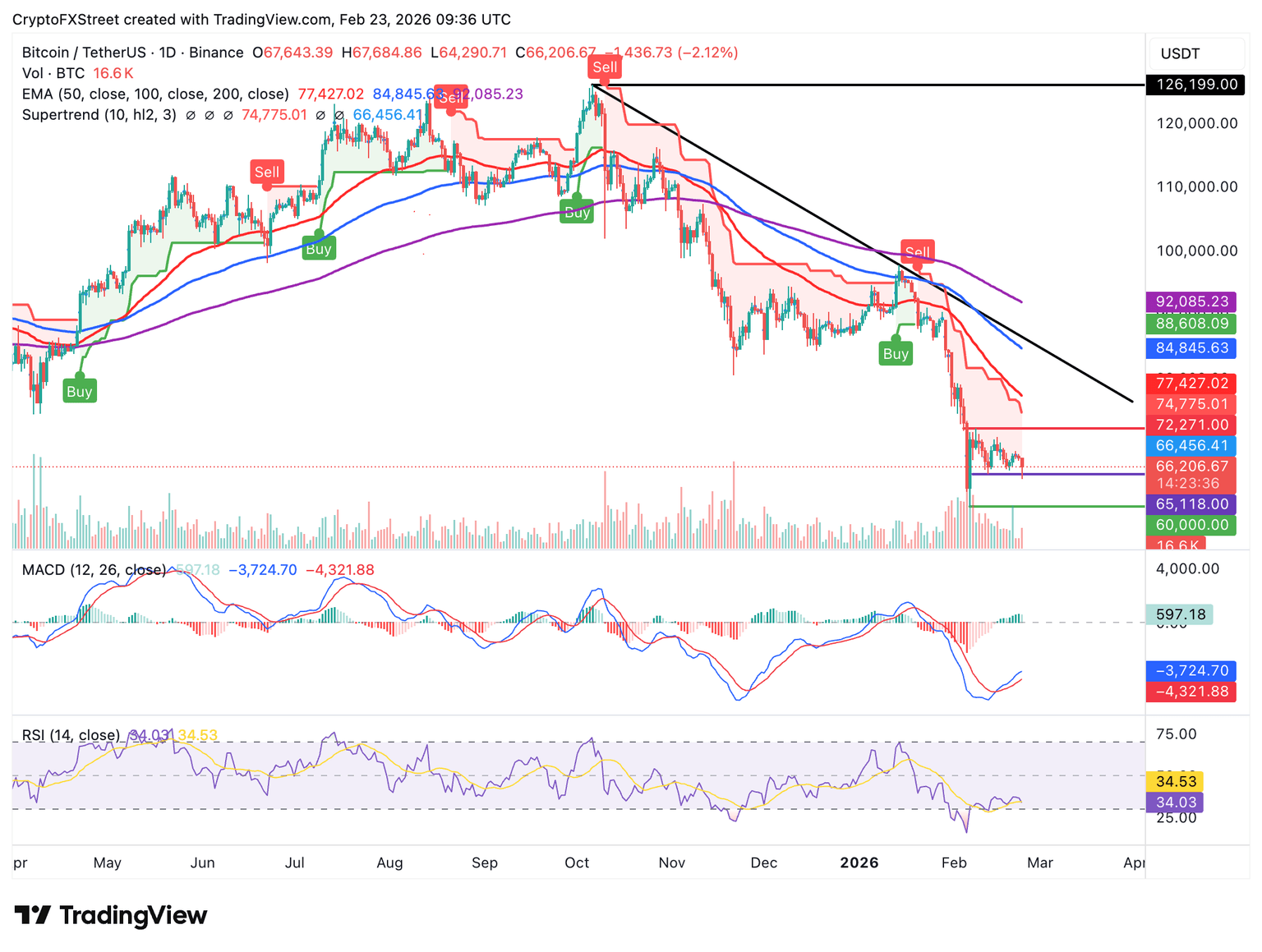 Los indicadores técnicos clave, como el Índice de Fuerza Relativa (RSI) en 34 en el gráfico diario, sugieren que el impulso bajista puede persistir en las próximas sesiones. El indicador SuperTrend parece limitar el alza del BTC en 72.271$. Por lo tanto, los operadores no deben perder de vista el mínimo intradía en 64.291$, que probablemente absorberá la presión de venta y detendrá más caídas hacia 60.000$.