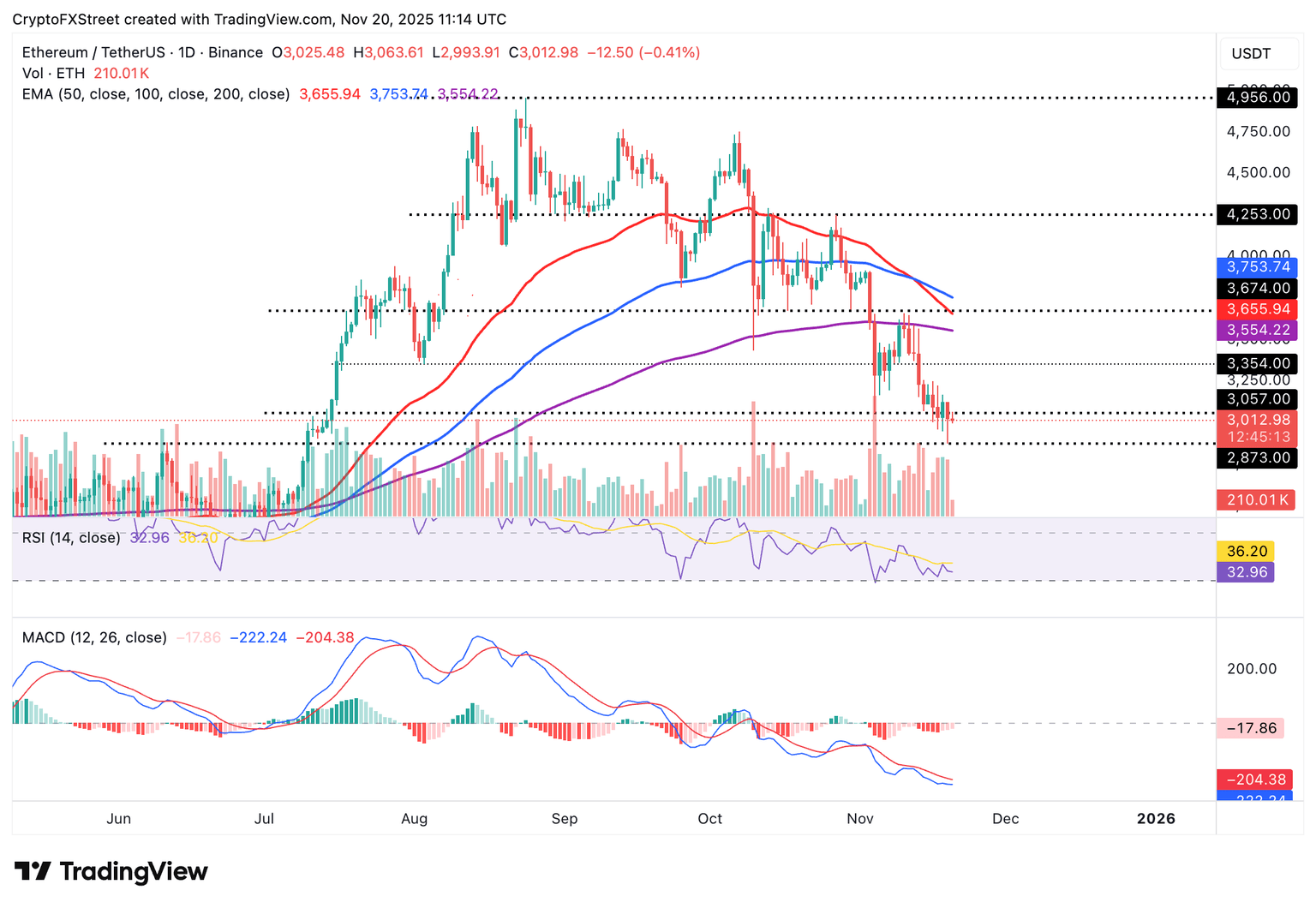 Ethereum se está negociando por encima de su soporte a corto plazo en 3.000$, pero se mantiene por debajo de medias móviles clave, incluida la Media Móvil Exponencial (EMA) de 200 días en 3.554$, la EMA de 50 días en 3.655$ y la EMA de 100 días en 3.753$, todas las cuales apuntan a una perspectiva bajista y una estructura técnica débil.