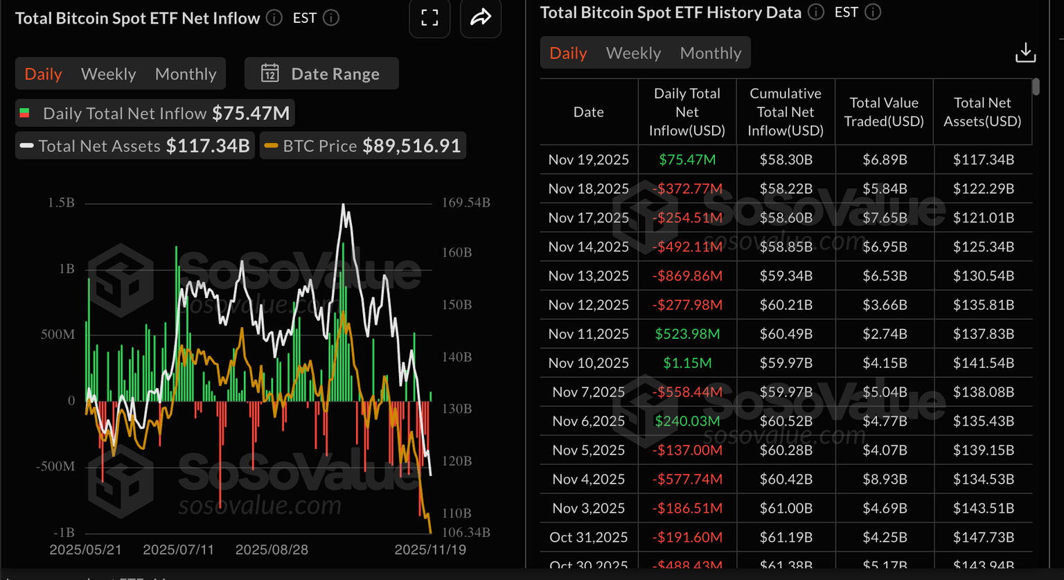 Los ETF de Bitcoin listados en EE.UU. experimentaron entradas moderadas de aproximadamente 74 millones de dólares el miércoles, después de cinco días consecutivos de salidas. Los datos de SoSoValue muestran una entrada neta acumulada de 58 mil millones de dólares, con activos netos de 117 mil millones de dólares.