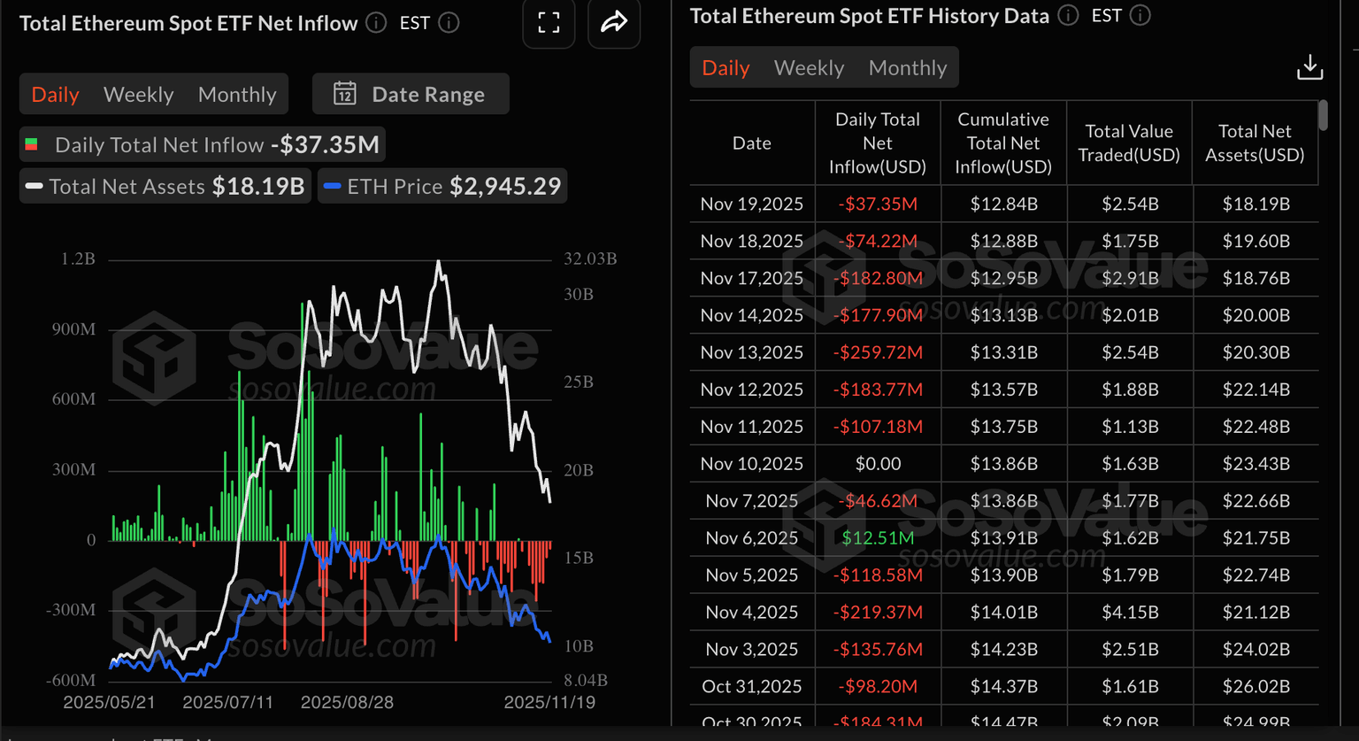 Los ETFs de Ethereum listados en EE.UU. continúan experimentando salidas, con aproximadamente 37 millones de dólares registrados el miércoles. El volumen de entrada neta acumulada se sitúa en 12.84 mil millones de dólares con activos netos de 18.19 mil millones de dólares.