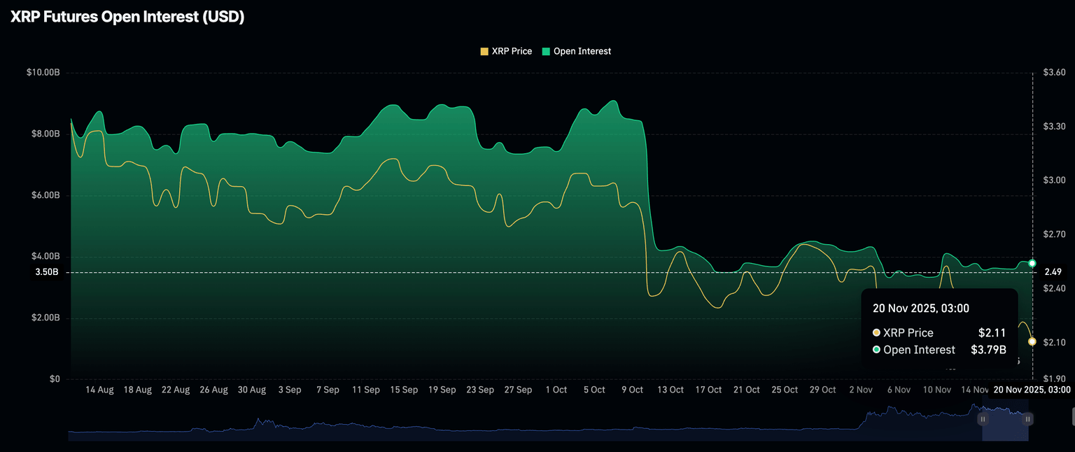 Mientras tanto, el mercado de derivados de XRP se ha mantenido tranquilo desde el colapso repentino del 10 de octubre. El interés abierto (OI) de futuros promedia 3.79 mil millones de dólares el jueves, por debajo de los 3.85 mil millones de dólares del miércoles.