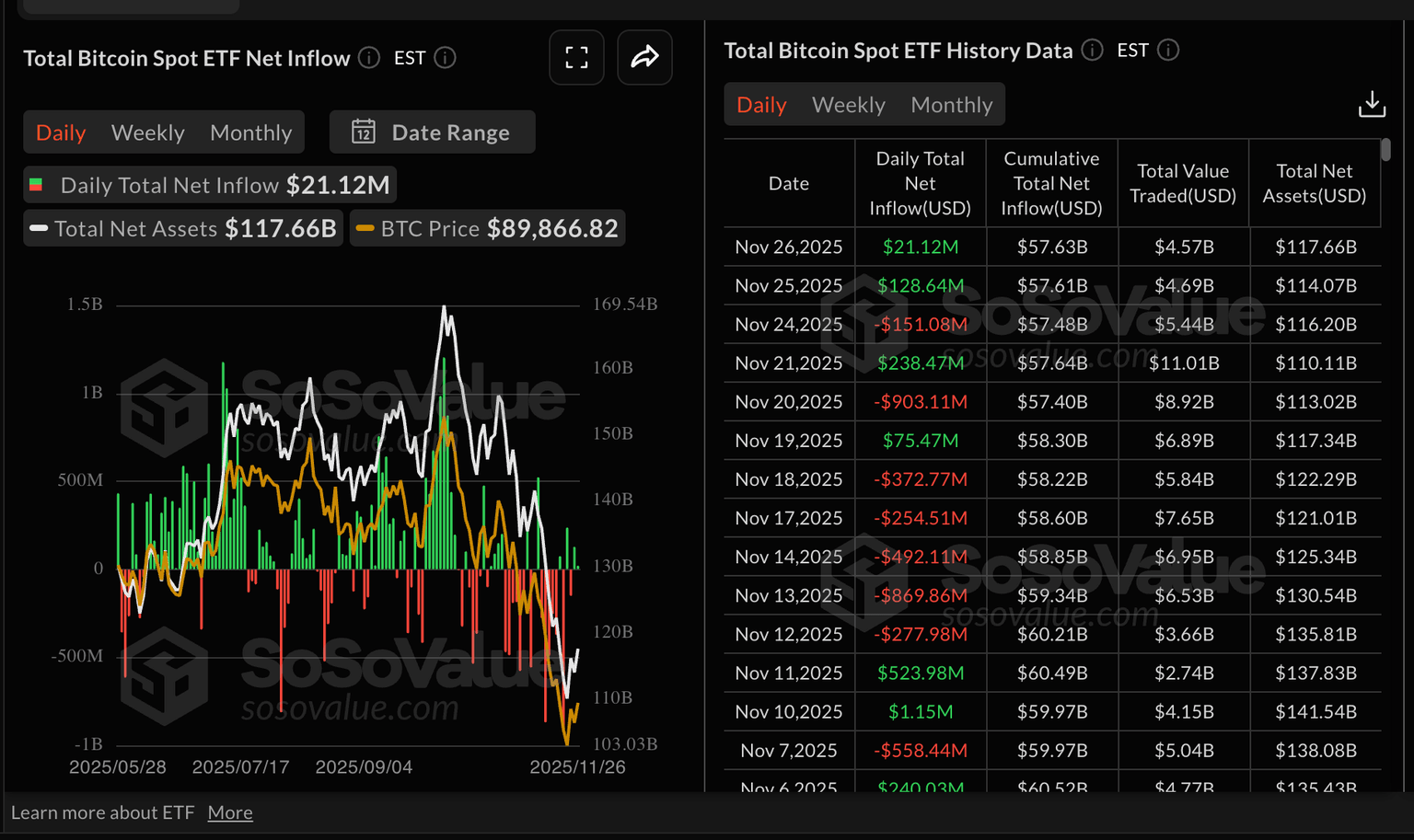 Los ETF de Bitcoin listados en Estados Unidos (EE.UU.) experimentaron entradas el miércoles, reflejando una mejora en el apetito por el riesgo entre los inversores institucionales. Los datos de SoSoValue muestran que Bitcoin registró entradas moderadas en ETF, totalizando 21 millones de dólares el miércoles, lo que apunta a un sutil regreso de los inversores institucionales.