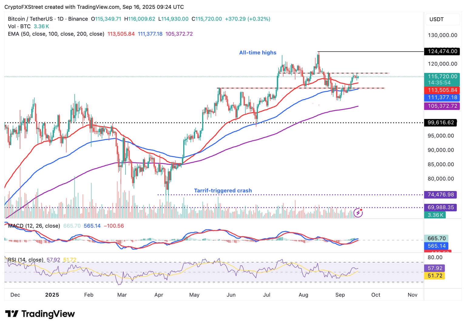 El Bitcoin (BTC) se acerca al nivel de 116.000$ el martes después de recuperar el soporte en torno a 115.000$. La ola de volatilidad que barrió el mercado de criptomonedas el día anterior recortó parte de las ganancias acumuladas la semana pasada, ya que los inversores se centraron en la Decisión sobre la Tasa de Interés de la Reserva Federal de los Estados Unidos (Fed) el miércoles.