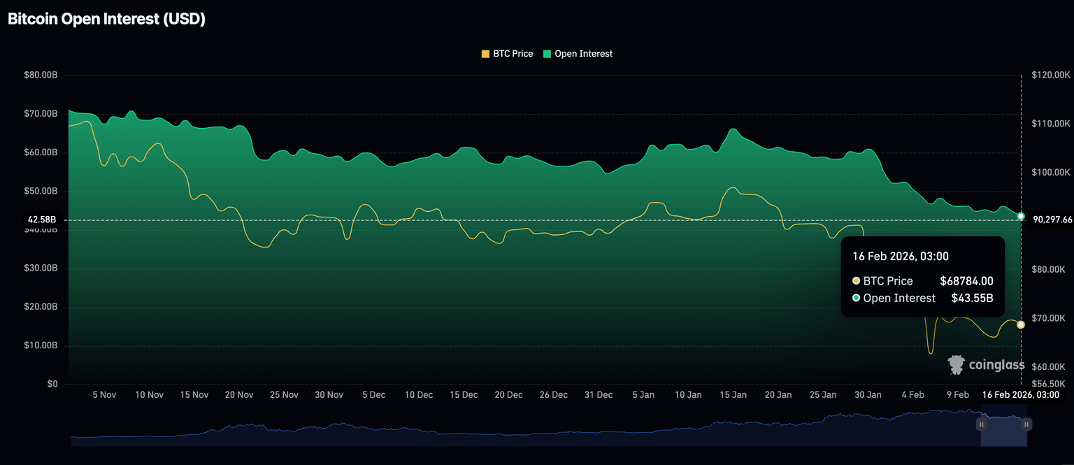 Bitcoin se negocia en medio de condiciones débiles en el mercado de derivados, ya que el interés abierto de futuros (OI) cae a 43.55 mil millones de dólares el lunes desde 44.87 mil millones de dólares. Desde que Bitcoin alcanzó un máximo histórico de 126.199$ en octubre y un OI de 94.12 mil millones de dólares, los inversores minoristas han ido perdiendo interés gradualmente, alimentando una persistente caída de precios.