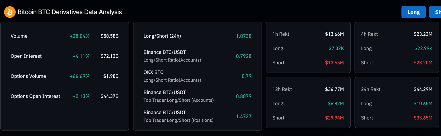 - El interés abierto de derivados de Bitcoin se dispara a 72.000 millones de dólares mientras el volumen de negociación se acerca a 60.000 millones de dólares en las últimas 24 horas, señalando un regreso al apetito de riesgo.
