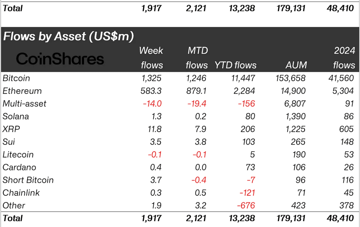 Los activos de Ethereum bajo gestión (AUM) se dispararon a 14.900 millones de dólares, mientras que XRP destacó entre las altcoins, con más de 11,8 millones de dólares en entradas semanales. Sui experimentó un renovado interés de los inversores, con entradas de la semana pasada alcanzando 3,5 millones de dólares.