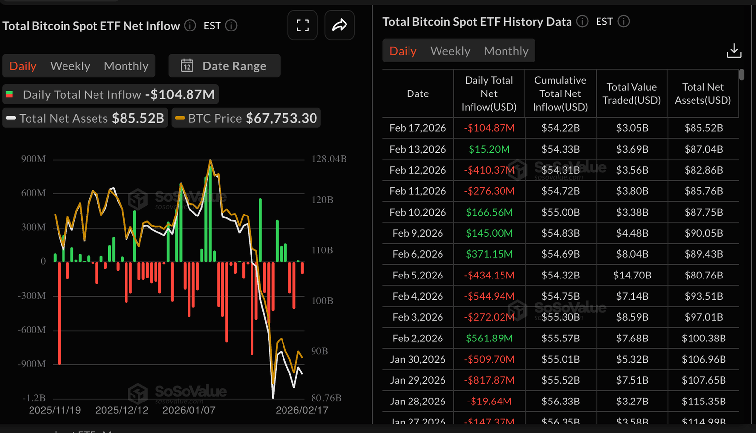 Al mismo tiempo, los fondos cotizados en bolsa (ETFs) de Bitcoin al contado pintan un panorama sombrío, como se refleja en aproximadamente 105 millones de dólares en salidas registradas el martes. Las entradas acumuladas se sitúan actualmente en 54.22 mil millones de dólares, con activos netos bajo gestión en 85.52 mil millones de dólares.