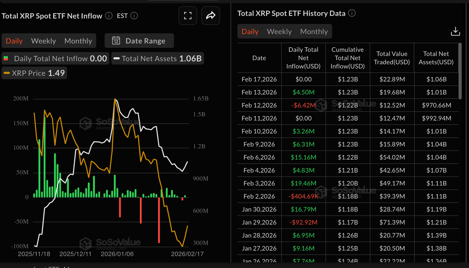 En cuanto a los ETFs de XRP al contado, la actividad fue moderada el martes, sin flujos registrados, según los datos de SoSoValue. La entrada acumulada ahora se sitúa en 1.23 mil millones de dólares, con activos netos bajo gestión en 1.06 mil millones de dólares. Al igual que con BTC y ETH, los activos totales en ETFs relacionados con XRP también han disminuido drásticamente después de alcanzar un máximo histórico de 1.65 mil millones de dólares el 5 de enero, lo que sugiere que el interés en los ETFs de XRP al contado listados en EE. UU. ha disminuido gradualmente en las últimas semanas.