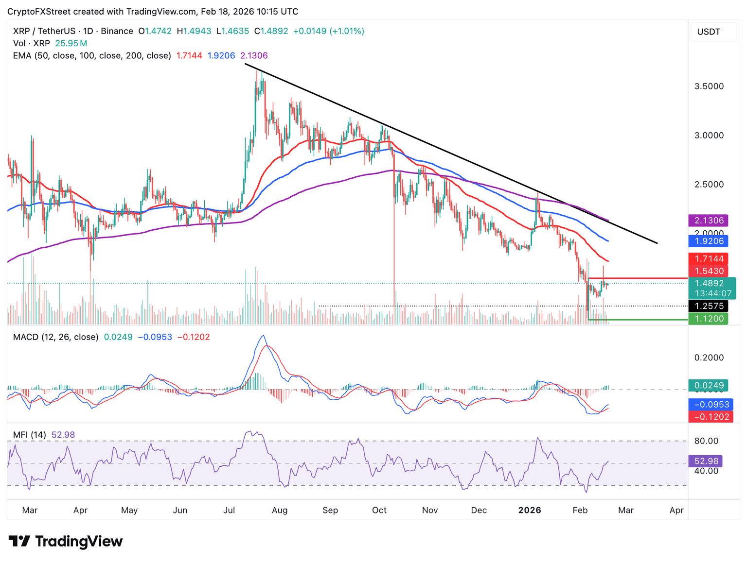 - XRP se negocia cerca del extremo superior del rango en 1.50$ en medio de señales positivas de los indicadores MACD y MFI.