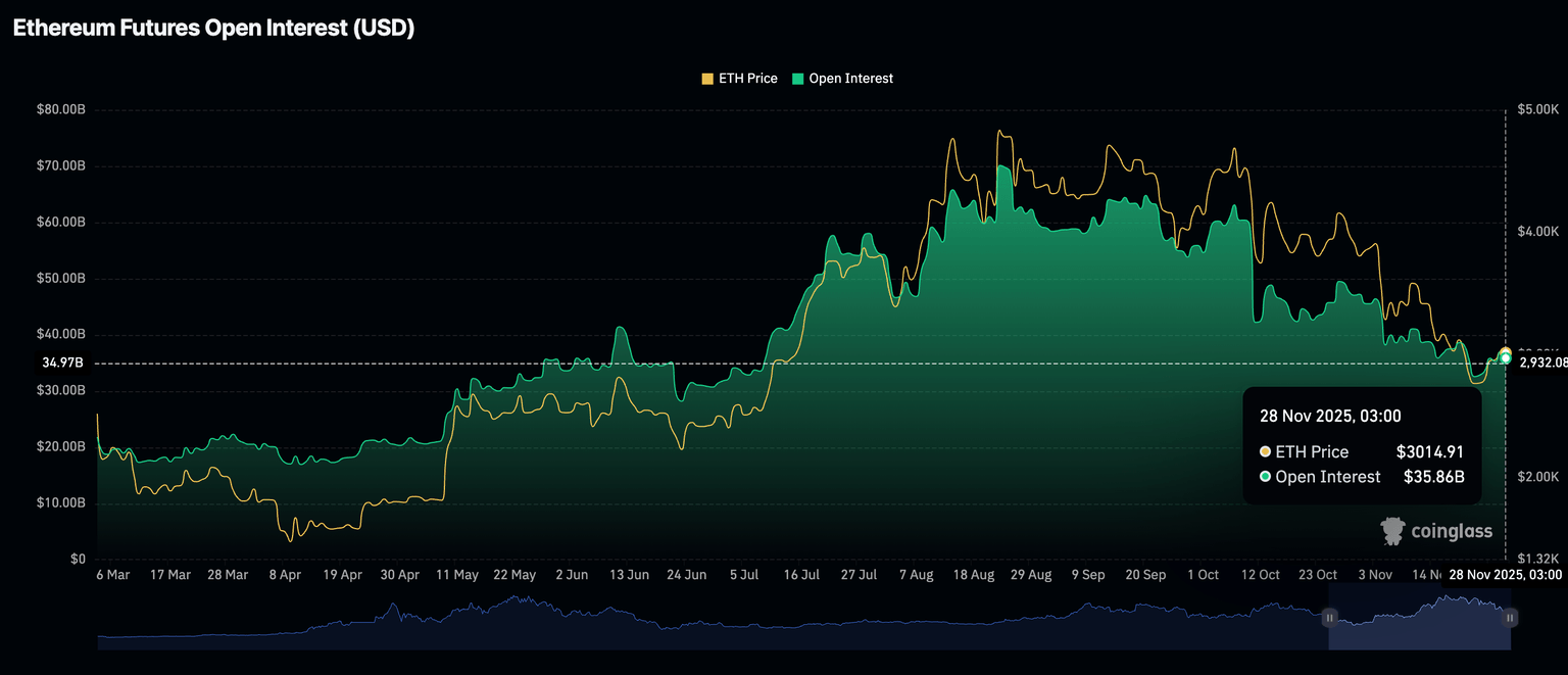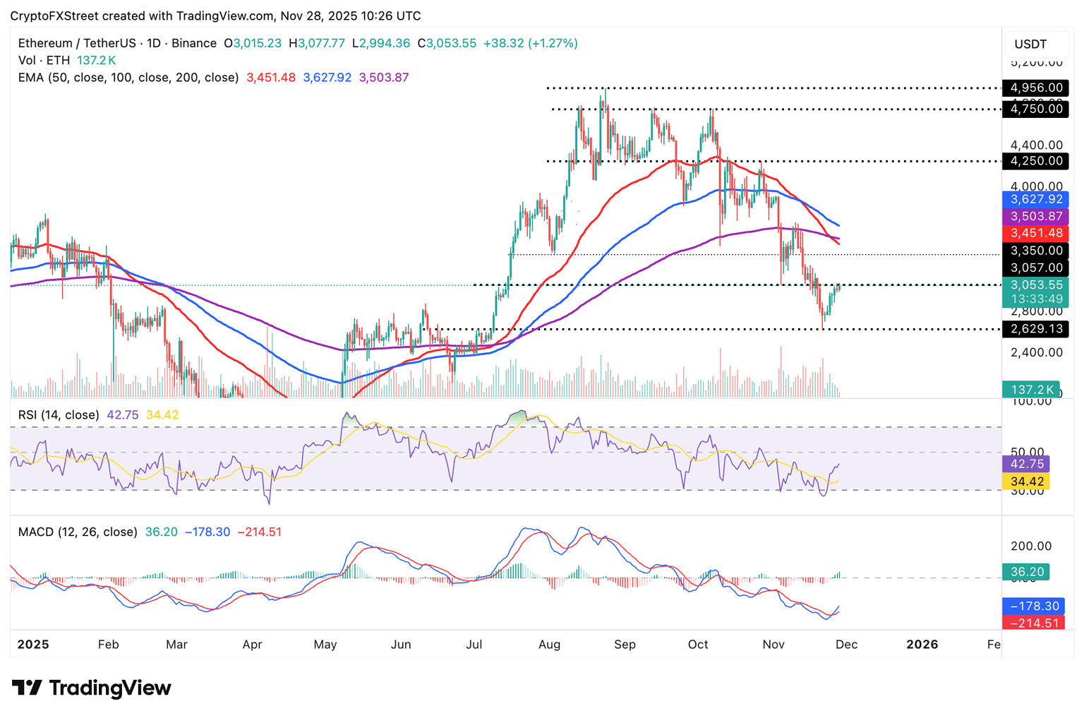 A pesar del soporte en 3.000 $, Ethereum sigue en riesgo de reanudar su caída hacia el soporte en 2.629 $, que fue probado el 21 de noviembre, a menos que la tendencia alcista avance por encima de la EMA de 50 días en 3.451 $ y la EMA de 200 días en 3.503 $.
