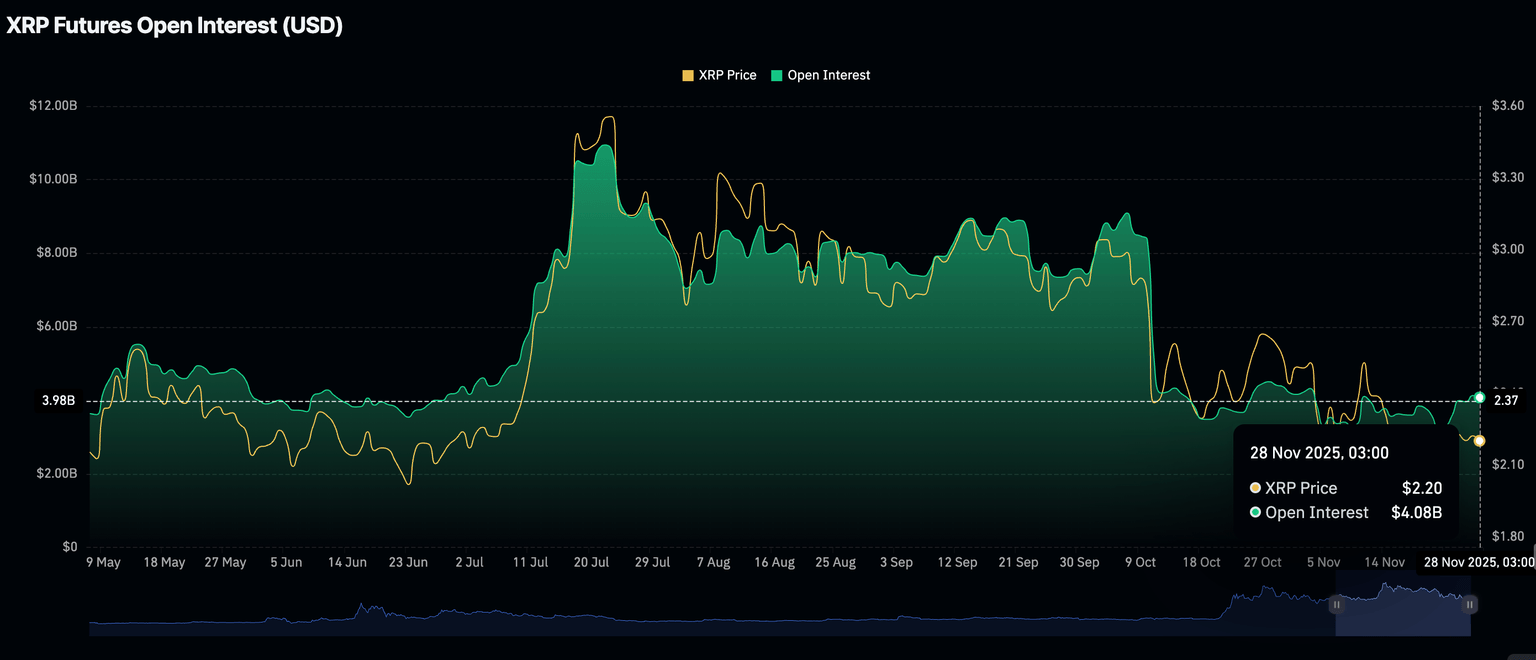 El mercado de derivados de XRP también está en una posición desfavorable, con un OI de futuros de 4.000 millones de dólares este viernes, más de la mitad por debajo de los 8.36 millones de dólares del 10 de octubre y los 10.94 millones de dólares, que marcaron el récord máximo el 22 de julio.