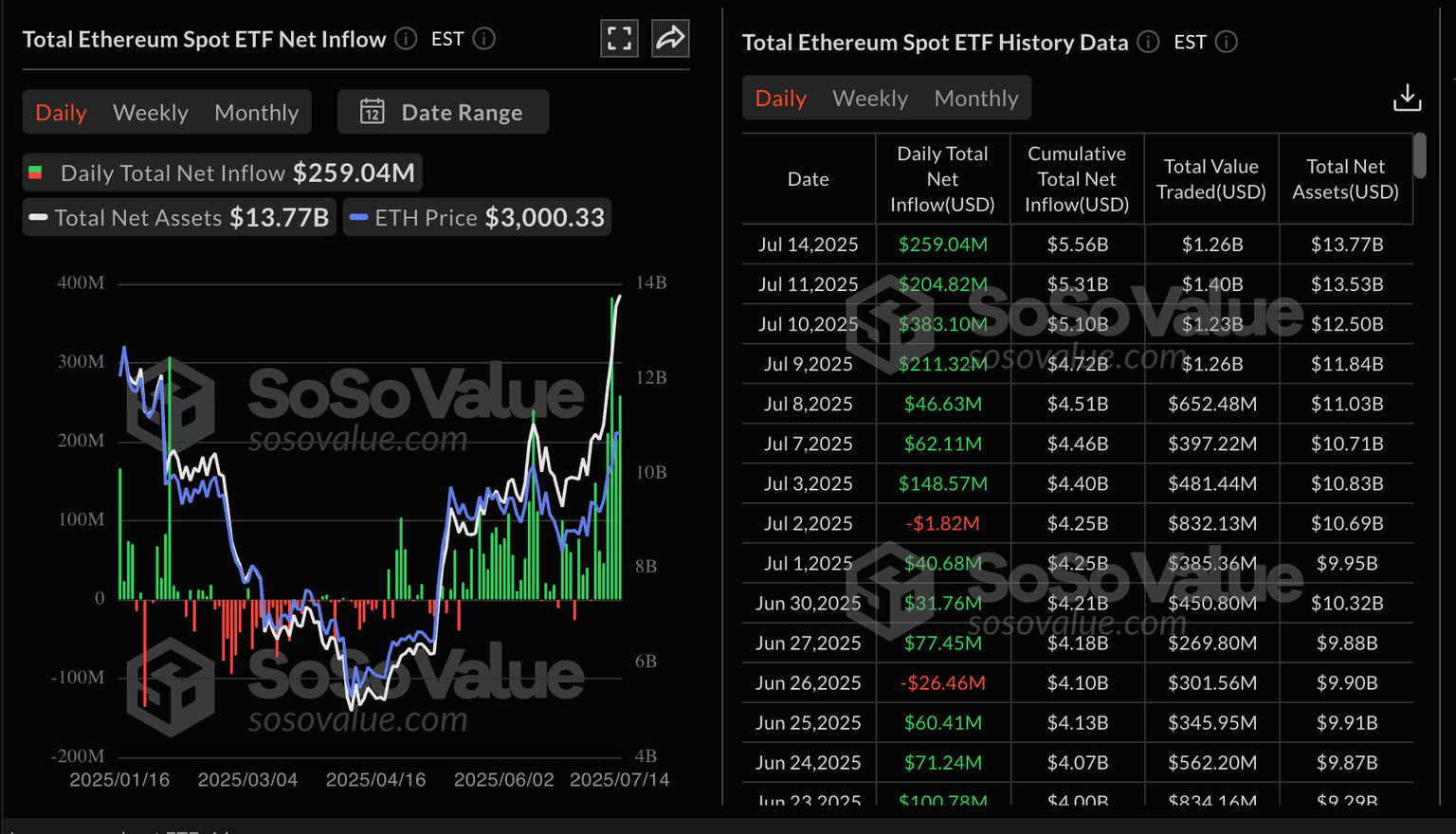 La tendencia alcista de los ETFs de Ethereum al contado se mantuvo estable el lunes, con entradas aumentando a 259 millones de dólares desde aproximadamente 205 millones de dólares el viernes. Esto marcó el séptimo día consecutivo de entradas, subrayando el sentimiento de riesgo de los institucionales.