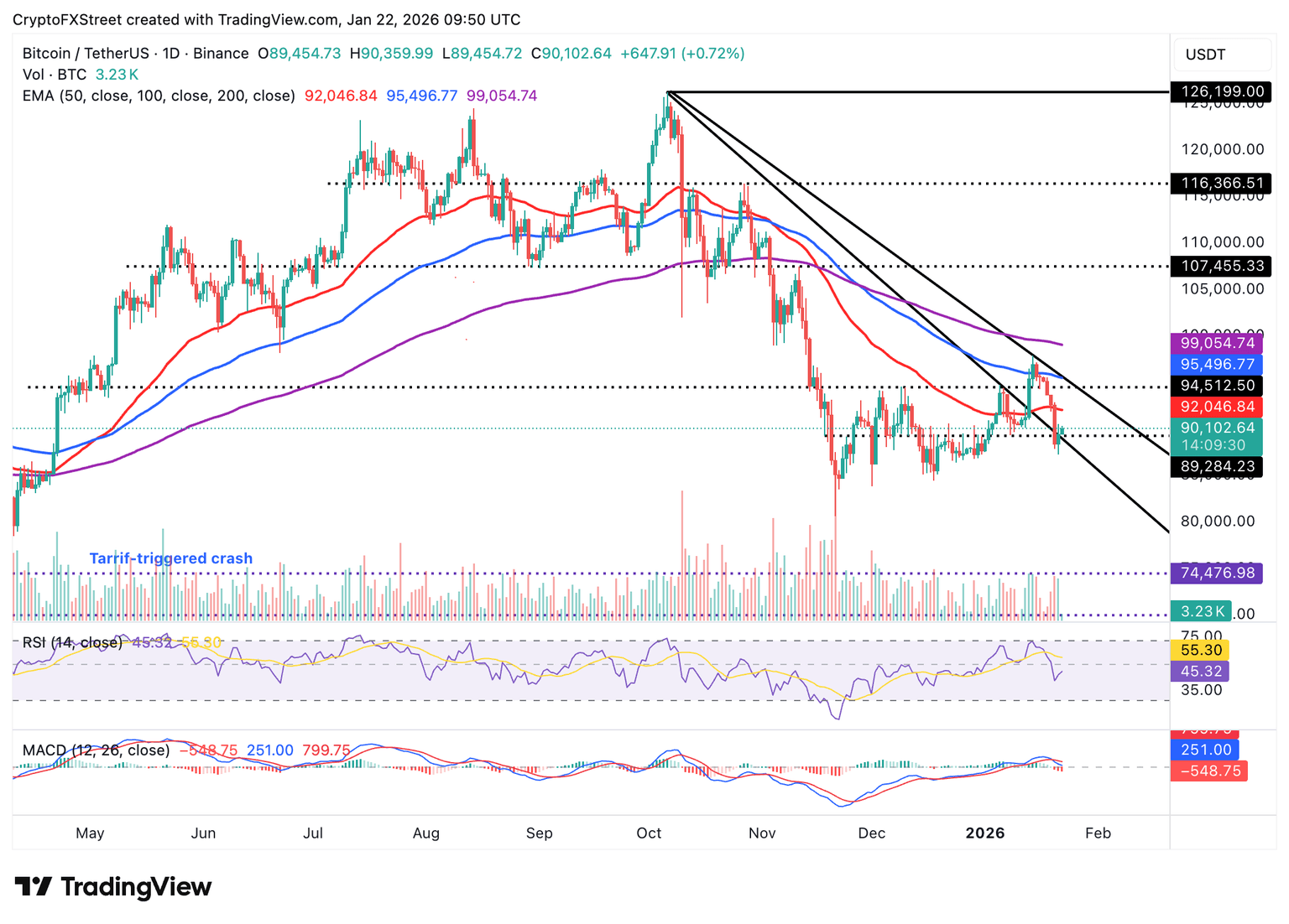 Un cierre diario por debajo del soporte de la línea de tendencia descendente podría empujar al Bitcoin a retestear el mínimo del miércoles en 87.263$.
