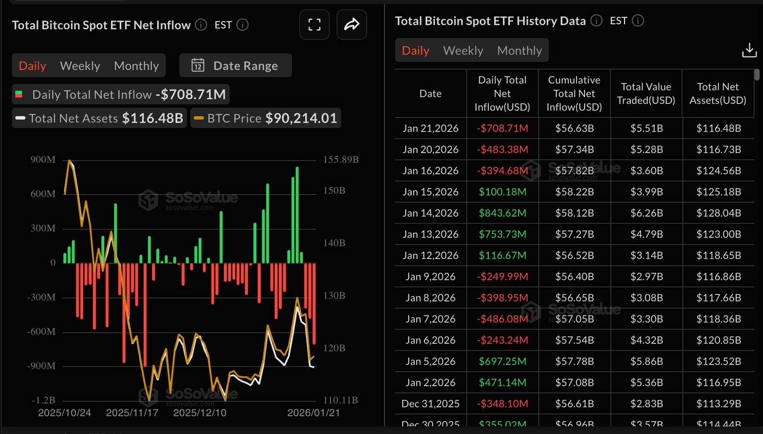 Los ETF de Bitcoin al contado continuaron enfrentando intensa presión de venta, con salidas alcanzando la asombrosa cifra de 709 millones de dólares el miércoles. El total acumulado de entradas se sitúa en 56.63 mil millones de dólares, y el activo neto en 116.48 mil millones de dólares, según datos de SoSoValue.