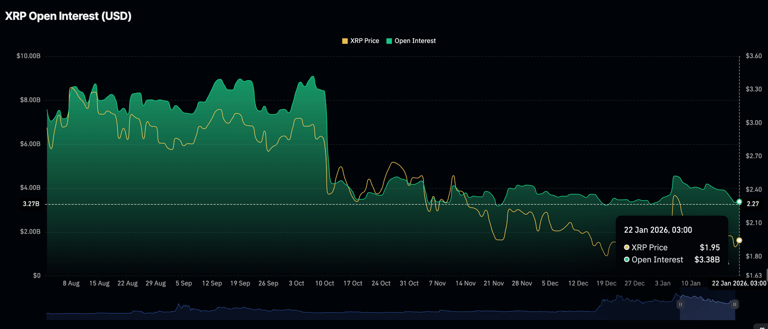 A pesar de las entradas generales constantes en los ETF de XRP, el interés minorista ha permanecido en gran medida moderado. CoinGlass muestra que el interés abierto de futuros (OI) promedia 3.38 mil millones de dólares el jueves, un ligero aumento desde 3.35 del día anterior. El OI ha disminuido desde los 4.55 mil millones de dólares registrados el 6 de enero, subrayando el sentimiento de aversión al riesgo predominante.