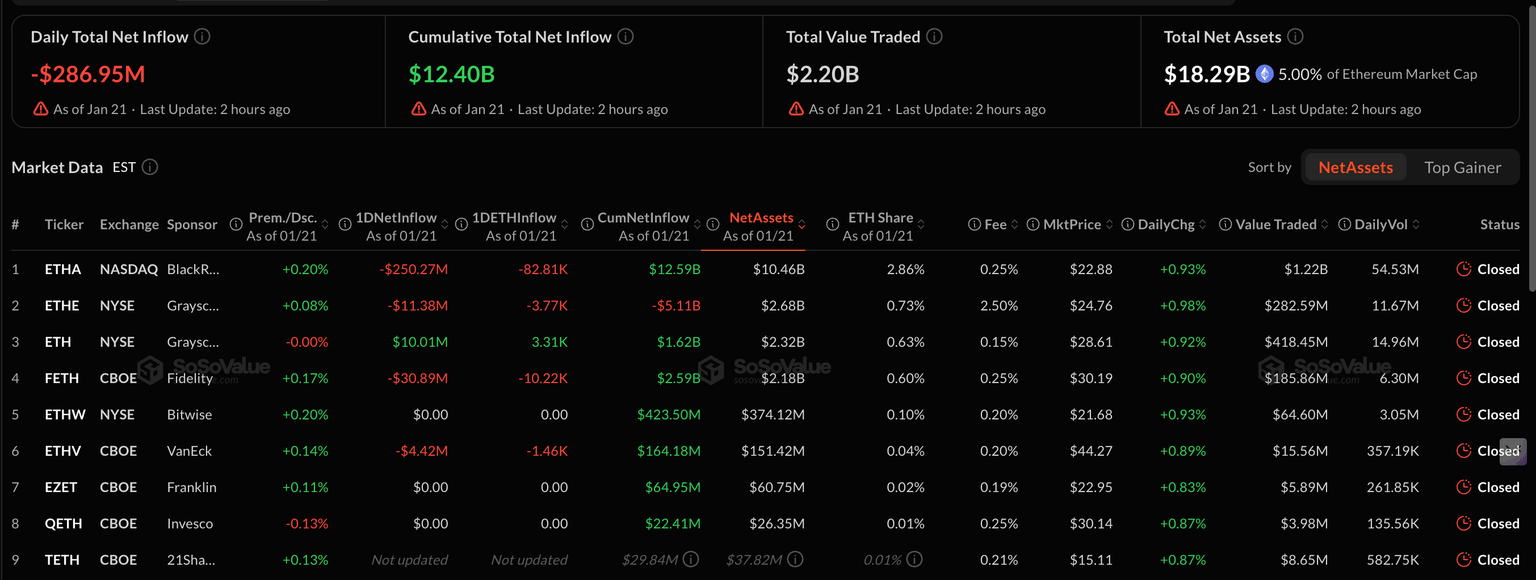 Los ETF de Ethereum no han sido inmunes a los vientos en contra en el mercado cripto, ya que las salidas se acercaron a 287 millones de dólares el miércoles, con las únicas entradas de aproximadamente 10 millones de dólares provenientes de Grayscale. El total acumulado de entradas se sitúa actualmente en 12.68 mil millones de dólares, y el activo neto en 18.41 mil millones de dólares, según datos de SoSoValue.