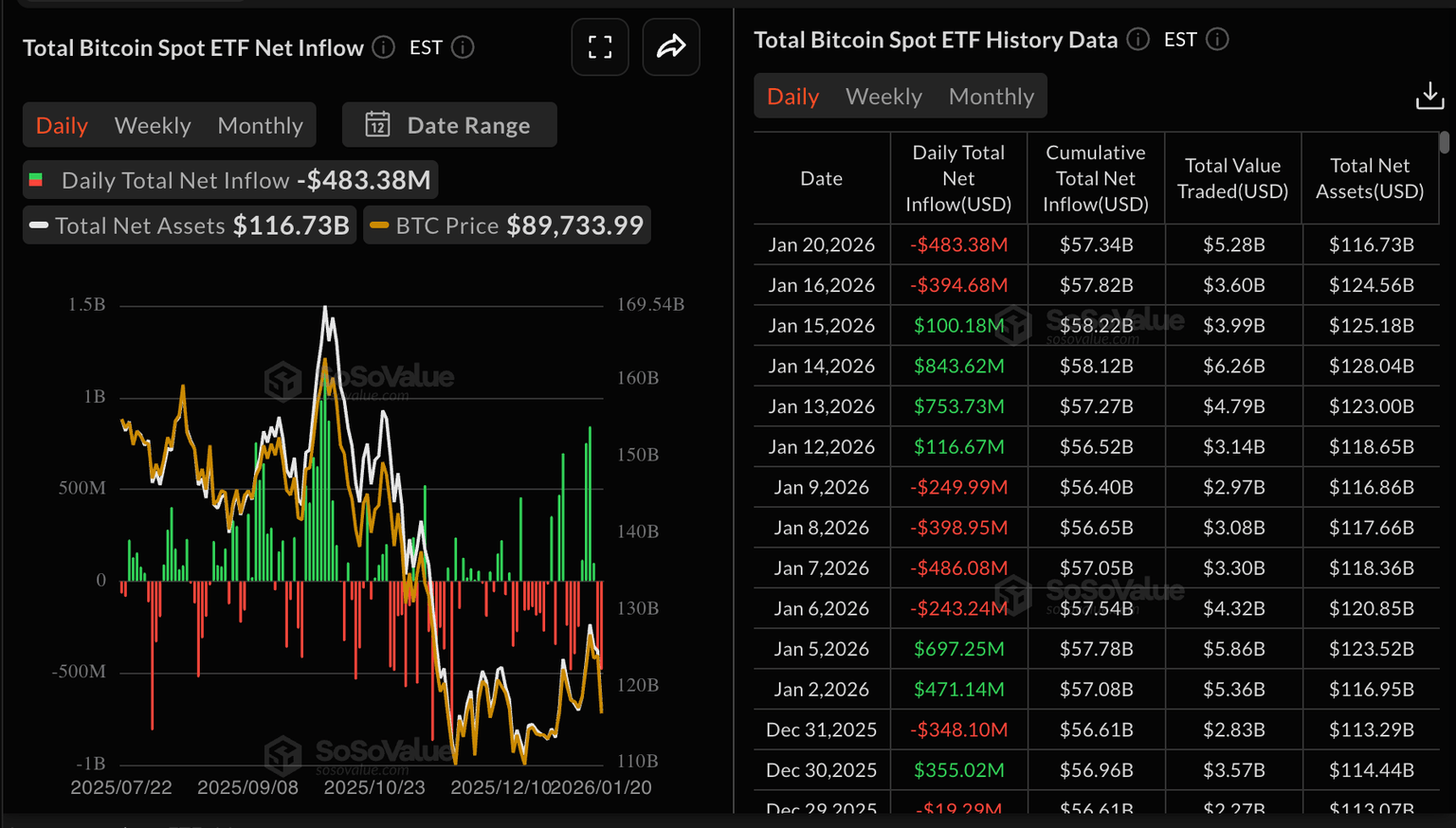 Los fondos cotizados en bolsa (ETF) de Bitcoin al contado extendieron las salidas por segundo día, con 483 millones de dólares retirados el martes. El total acumulado de entradas se sitúa en aproximadamente 57.3 mil millones de dólares, y los activos netos en 116.7 mil millones de dólares.