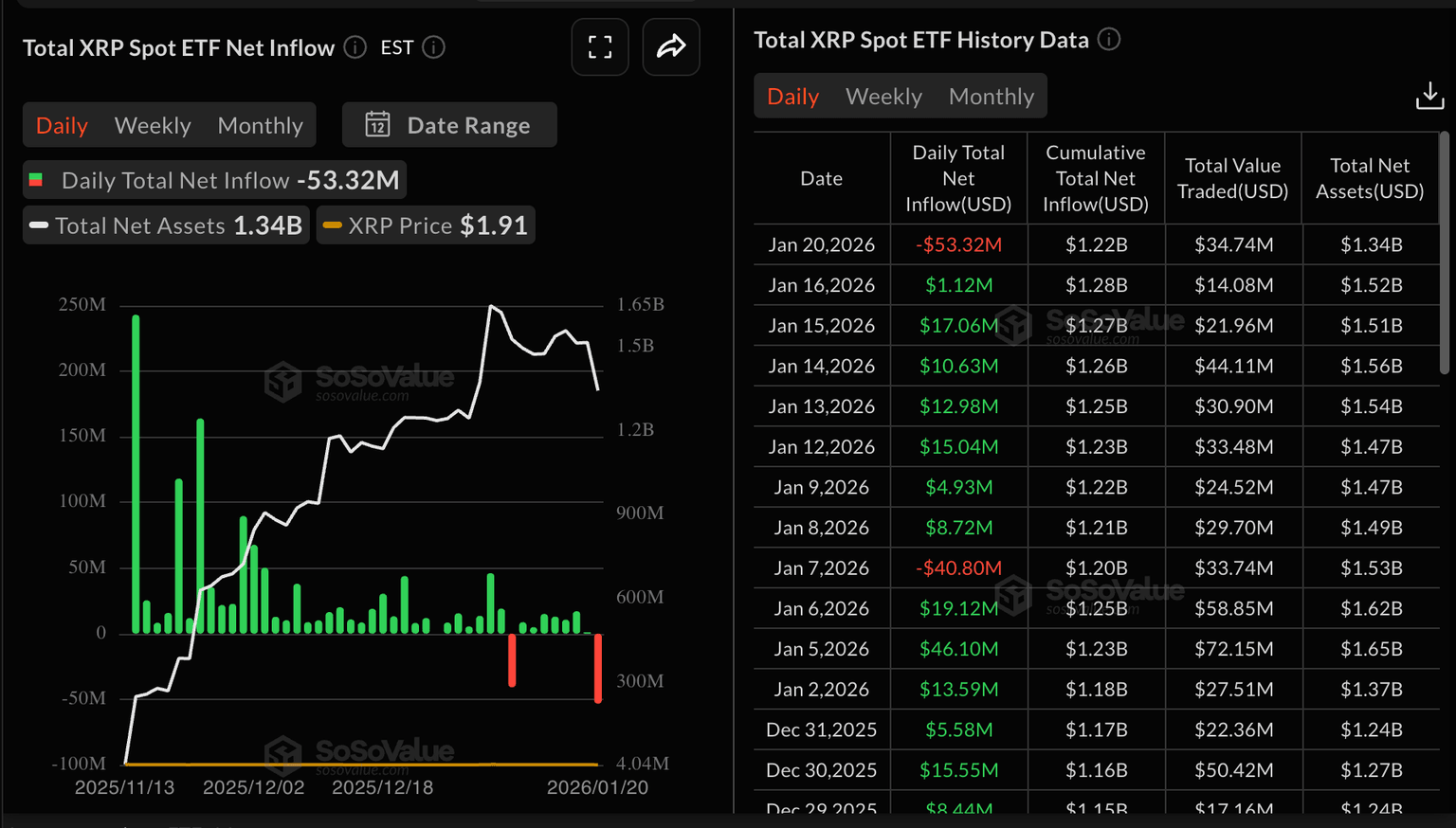 Mientras tanto, los ETF de XRP al contado registraron su segunda salida desde su lanzamiento en noviembre. Los ETF listados en EE.UU. publicaron aproximadamente 53 millones de dólares en salidas el martes, llevando el total acumulado de entradas a 1.2 mil millones de dólares y los activos netos a 1.3 mil millones de dólares.