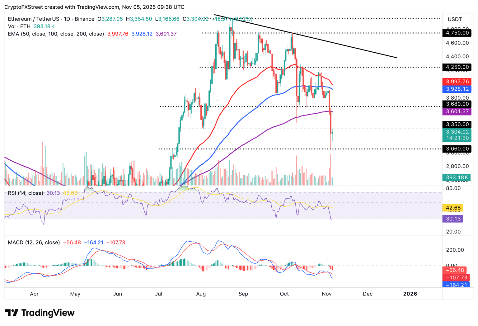 Ethereum está cotizando ligeramente por encima de los 3.300$ en el momento de escribir el miércoles, después de que los bajistas profundizaran la corrección el lunes, poniendo a prueba el soporte en 3.060$. El RSI en 29 en el gráfico diario señala condiciones de sobreventa, con una posible estabilidad que probablemente será seguida por un rebote inmediato hacia la siguiente resistencia destacada por la media móvil exponencial (EMA) de 200 días en 3.601$.