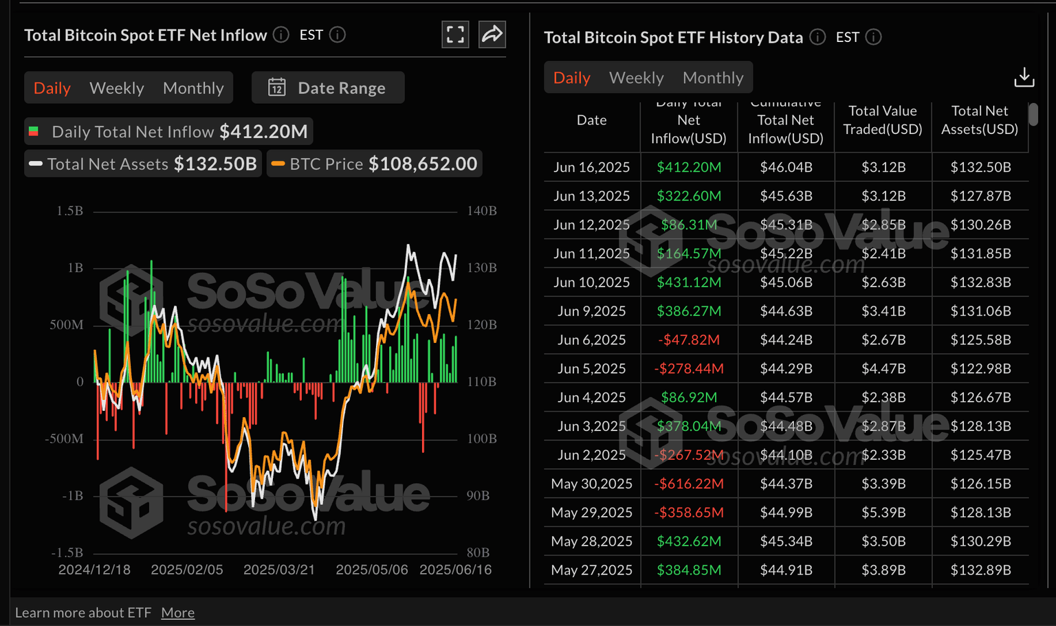 Las entradas en los fondos cotizados en bolsa (ETFs) al contado de EE.UU. extendieron la racha alcista de la semana pasada. Los datos de SoSoValue indican que los ETFs de Bitcoin al contado vieron una entrada neta diaria de 412 millones de dólares el lunes, superando los 323 millones registrados el viernes. El IBIT de BlackRock lideró con una entrada neta de 267 millones, seguido por el FBTC de Fidelity con 83 millones.