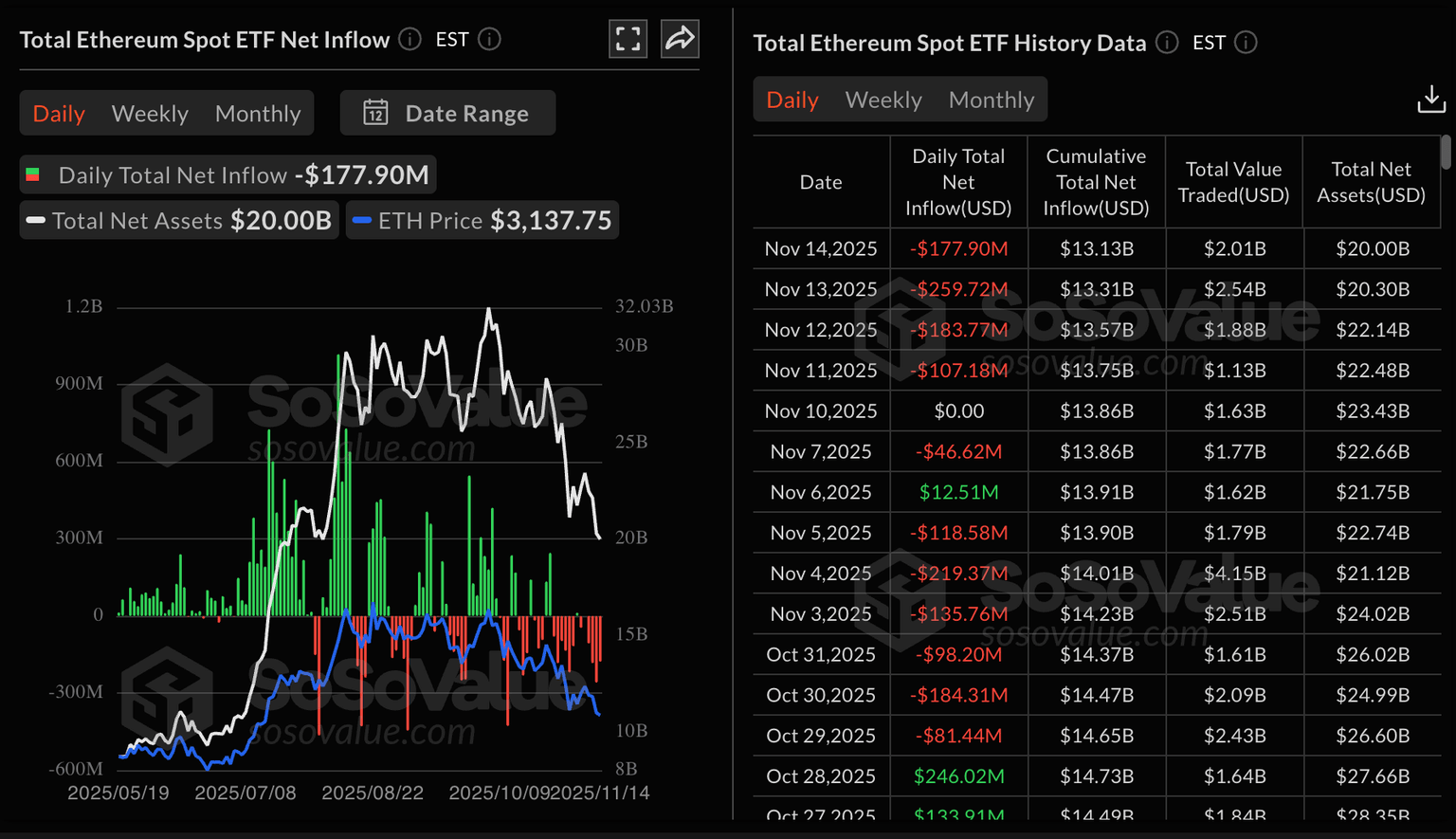 Los datos de SoSoValue muestran un volumen acumulado de entradas de 13.130 millones de dólares y activos netos de 20.000 millones de dólares. Si las salidas de ETF persisten, el sentimiento probablemente seguirá a la baja, dificultando que Ethereum mantenga la recuperación a corto y medio plazo.