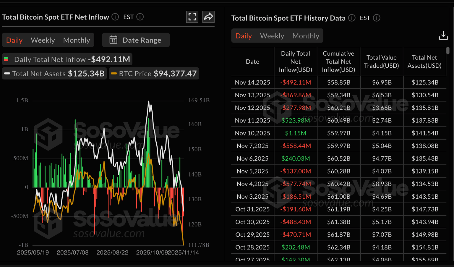 Los fondos cotizados en bolsa (ETFs) listados en EE.UU. extendieron la racha bajista con aproximadamente 492 millones de dólares en salidas el viernes. Según los datos de SoSoValue, el volumen acumulado de entradas de los ETFs de BTC promedia 58.850 millones de dólares el lunes, con activos netos de 125.340 millones de dólares.