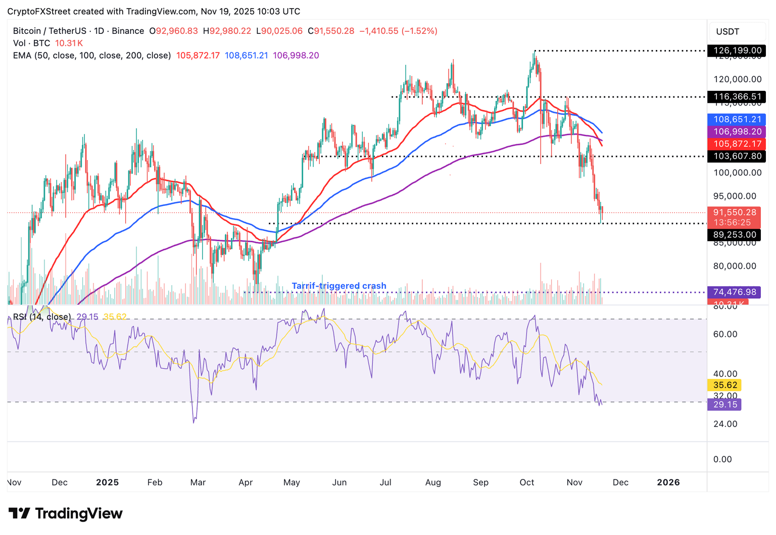 El Índice de Fuerza Relativa (RSI) ha entrado en la región de sobreventa en el gráfico diario, indicando que el impulso bajista está aumentando. Lecturas más bajas del RSI reforzarían la perspectiva bajista a corto plazo del Bitcoin, aumentando las probabilidades de un descenso constante por debajo de 90.000$.