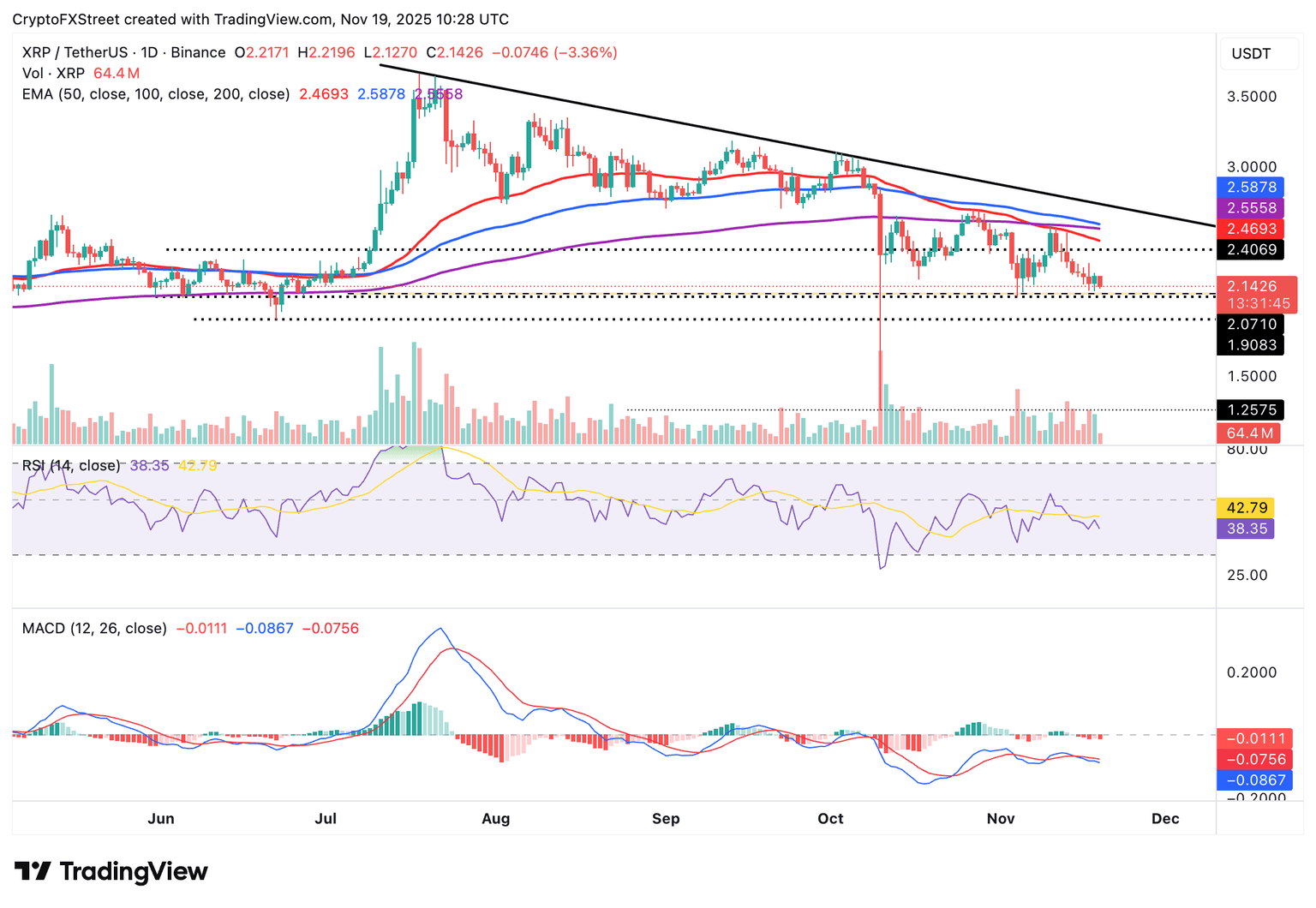 Si XRP cae por debajo de su zona de soporte inmediata en 2.07$–2.10$, podría desencadenar una caída por debajo de 2.00$. El siguiente nivel clave a observar es 1.90$, que fue probado por última vez en junio.