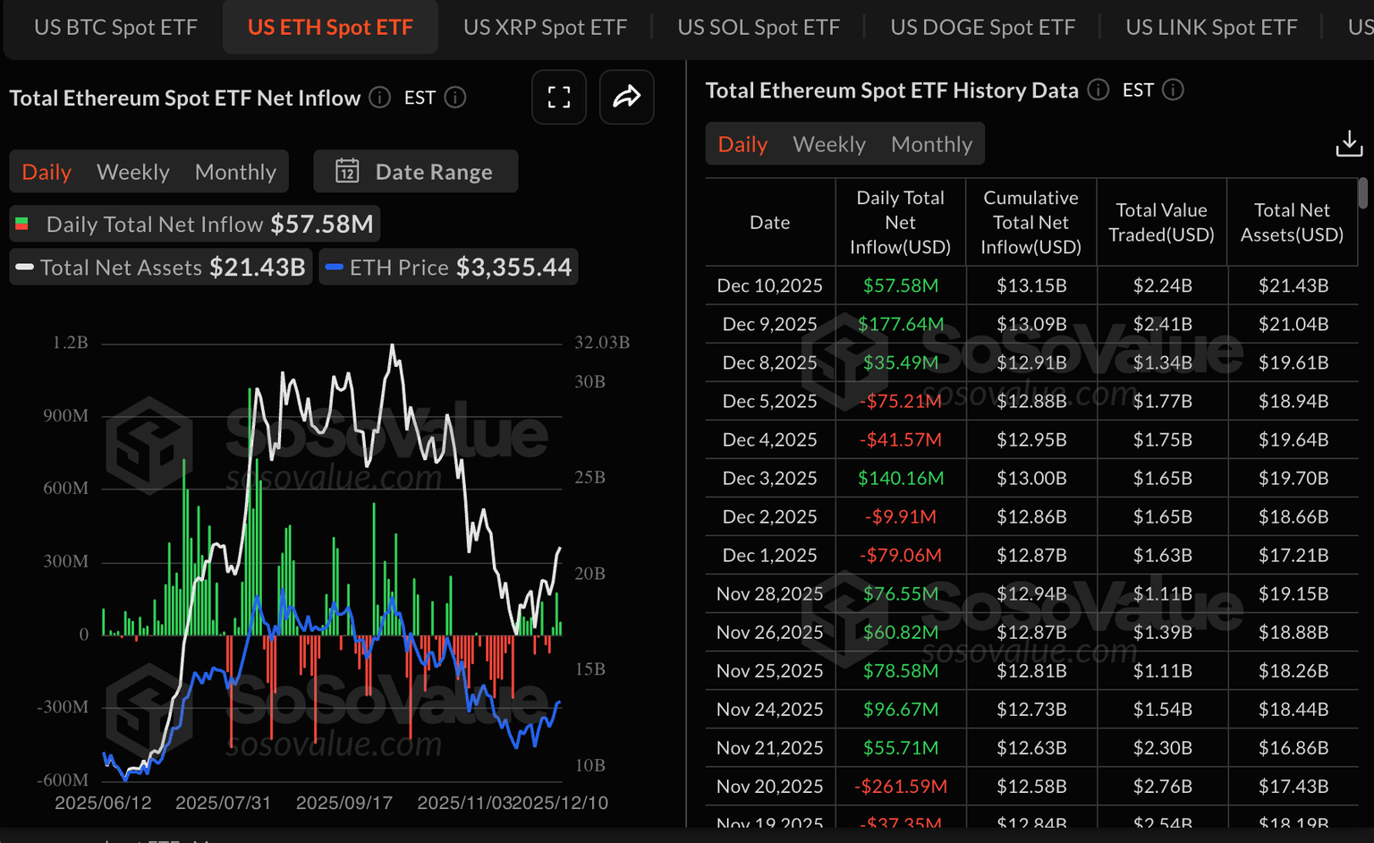 Los ETFs de Ethereum al contado listados en Estados Unidos (EE.UU.) también registraron entradas con casi 58 millones de dólares el miércoles. La altcoin más grande por capitalización de mercado ha acumulado 13.15 mil millones de dólares en volumen total de ETF, con activos netos de 21.43 mil millones de dólares. Las entradas constantes podrían moldear un sentimiento positivo y aumentar la demanda de Ethereum antes del Año Nuevo.