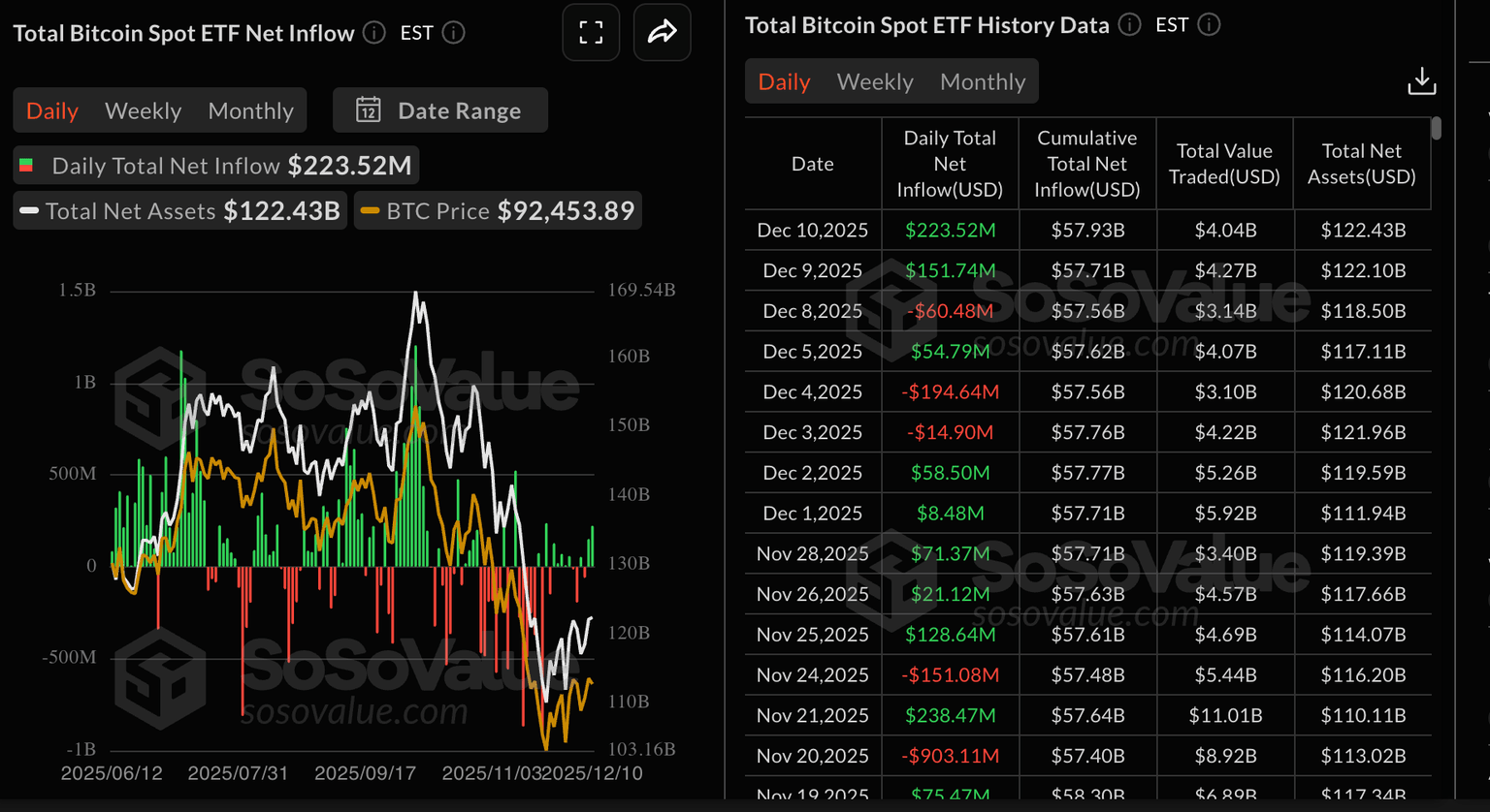 El volumen acumulado de entradas se sitúa actualmente en 57.93 mil millones de dólares, con activos netos de 122.43 mil millones de dólares, según datos de SoSoValue.