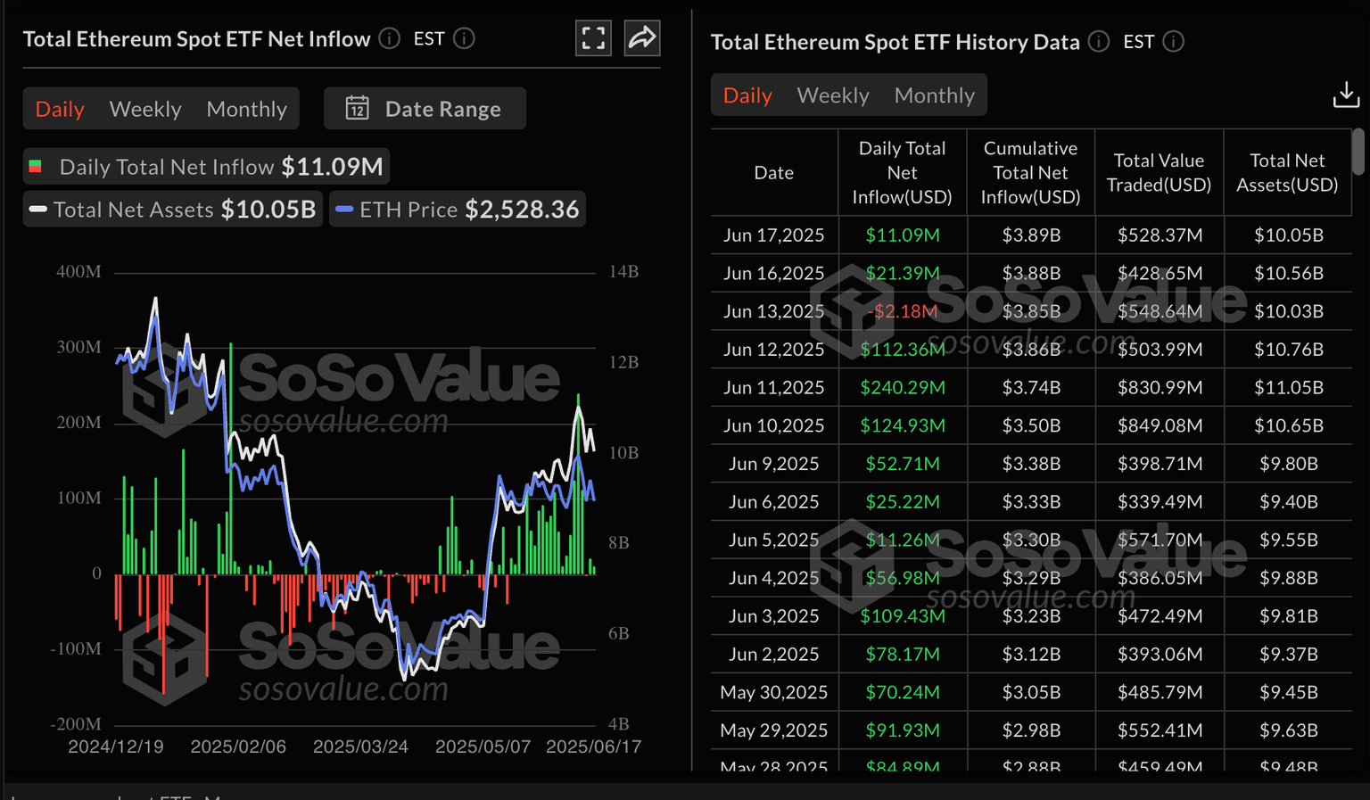 El interés en productos financieros relacionados con Ethereum continuó, aunque con una disminución significativa en comparación con las entradas observadas la semana pasada. SoSoValue muestra que los ETFs de Ethereum al contado experimentaron entradas netas de 11 millones de dólares el martes, una disminución de 21 millones de dólares el lunes.