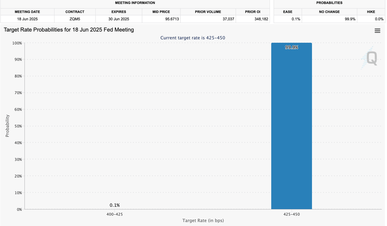 La herramienta FedWatch del CME Group indica que los participantes del mercado anticipan que la Fed mantendrá las tasas de interés en un rango de 4.25% a 4.50%.