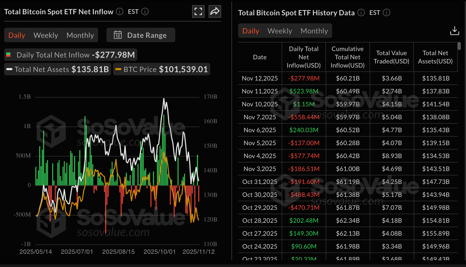 Según datos de SoSoValue, los ETFs listados en EE.UU. experimentaron salidas de aproximadamente 278 millones de dólares el miércoles, rompiendo una racha alcista de dos días. Las entradas del martes totalizaron 524 millones de dólares, y el lunes, 1.15 millones de dólares.