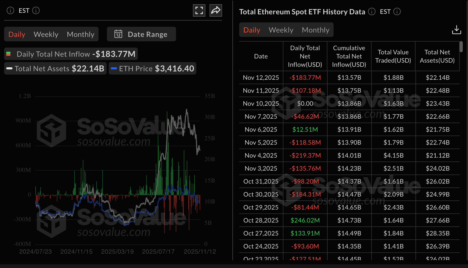 Los ETF de Ethereum extendieron su racha de salidas, con aproximadamente 184 millones de dólares retirados de productos listados en EE.UU. el miércoles. Las salidas de ETFs el martes totalizaron 107 millones de dólares, mientras que el lunes no hubo flujos.