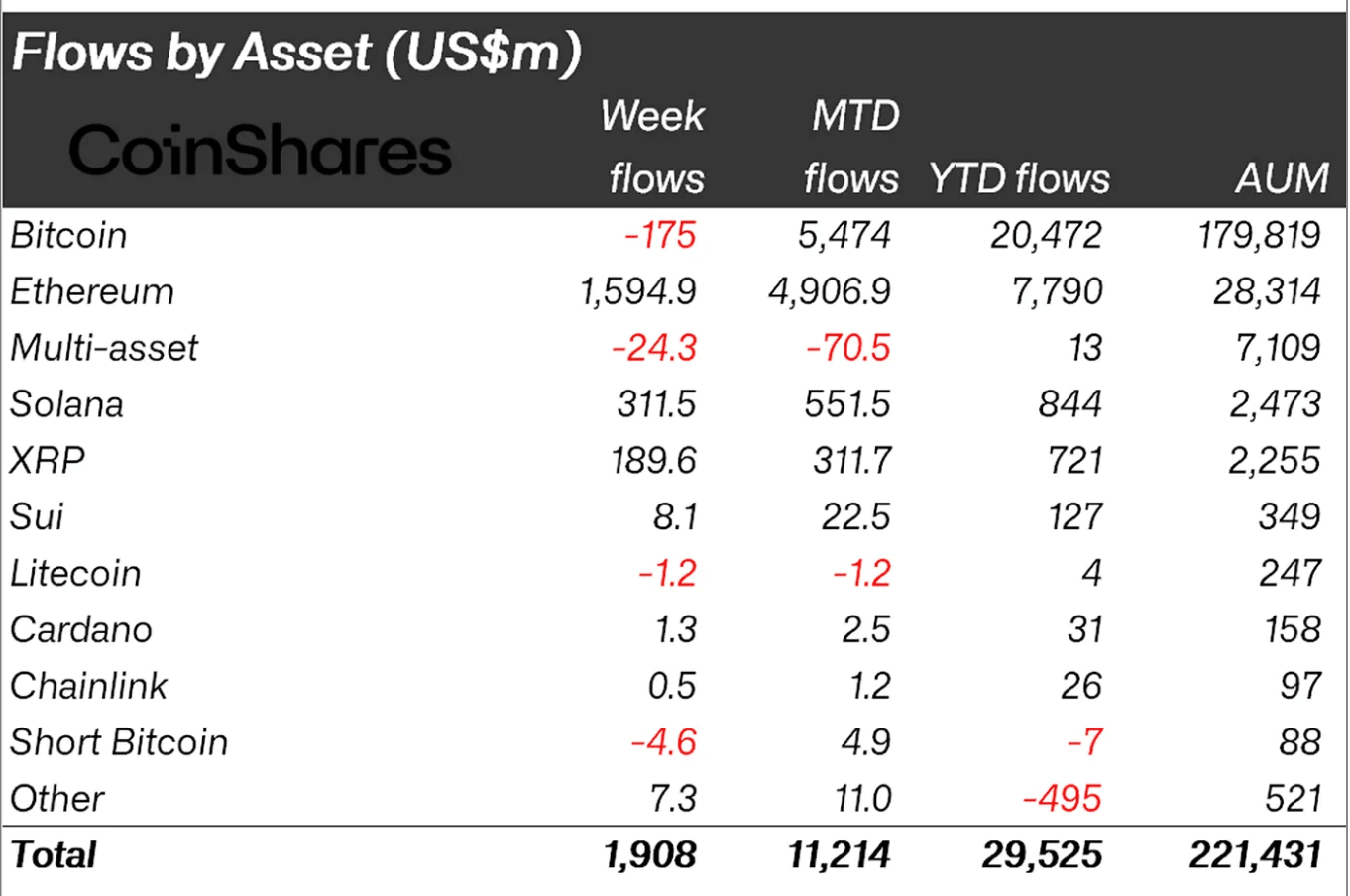 Los productos de inversión en activos digitales registraron entradas totales de 1.900 millones de dólares la semana pasada, según un informe de CoinShares. Ethereum dominó las entradas de capital con 1.590 millones de dólares, su segunda semana más grande en la historia.