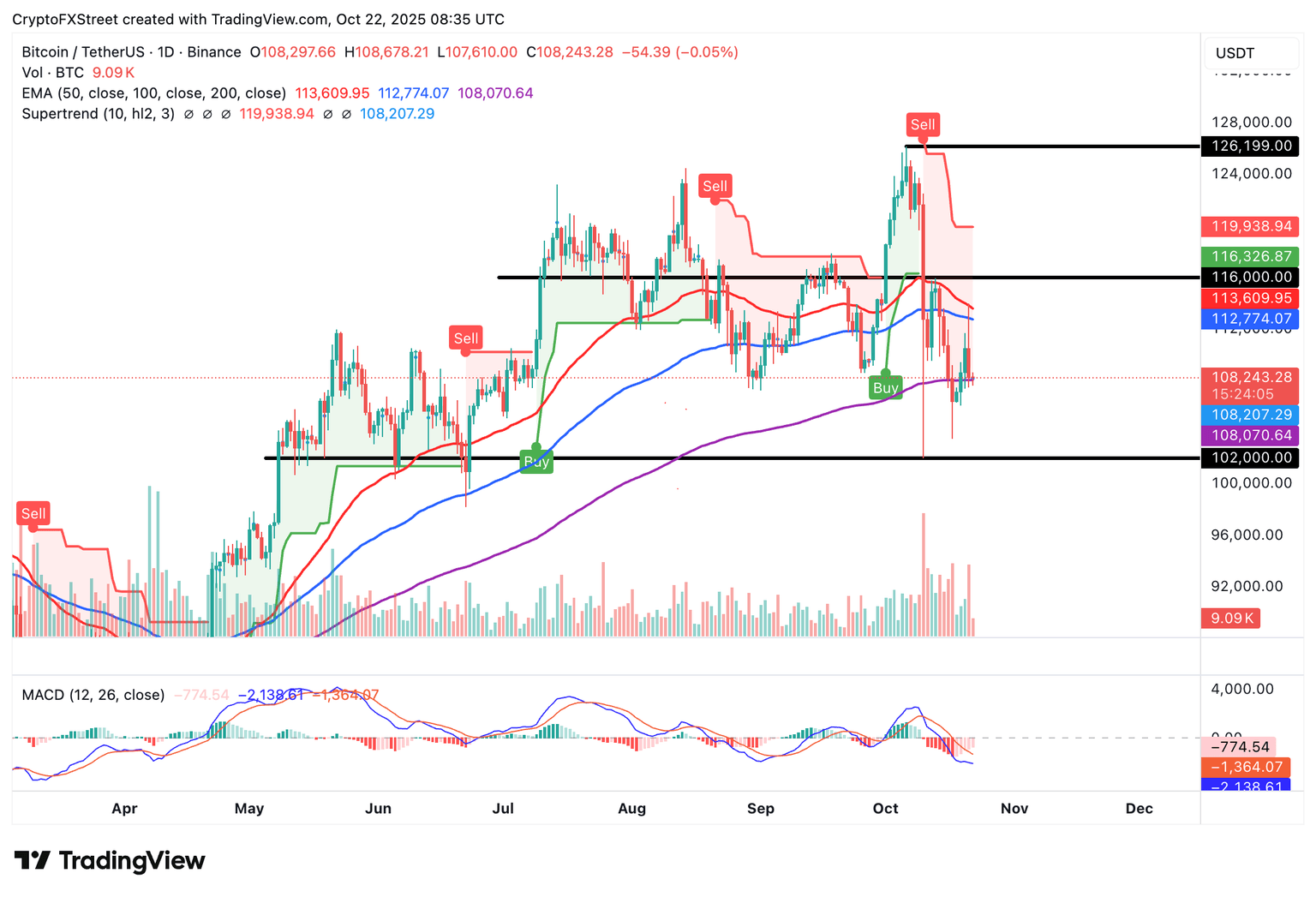 Los indicadores de Convergencia/Divergencia de Medias Móviles (MACD) y SuperTrend destacan una estructura técnica bajista, aumentando las probabilidades de extender la caída hacia los mínimos de octubre de BTC de 102.000$.