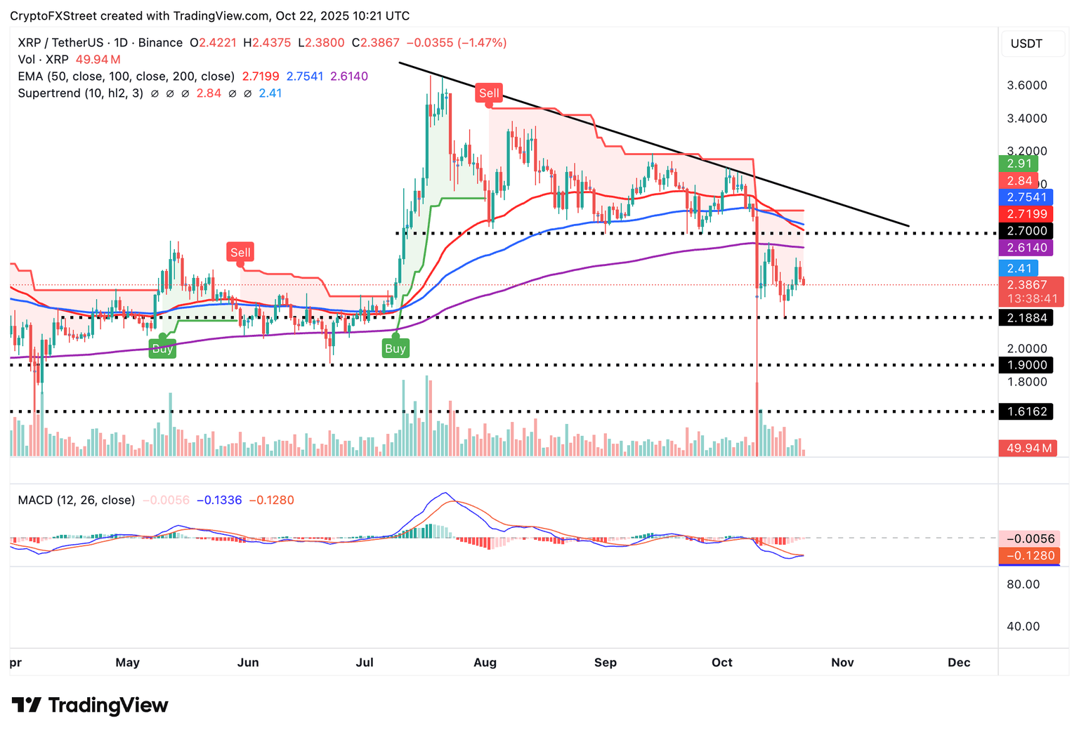 Una señal de venta mantenida por el MACD desde el 10 de octubre en medio del mayor evento de desapalancamiento que vio 19.000 millones de dólares en liquidaciones totales de criptomonedas, anima a los inversores a reducir la exposición al riesgo.