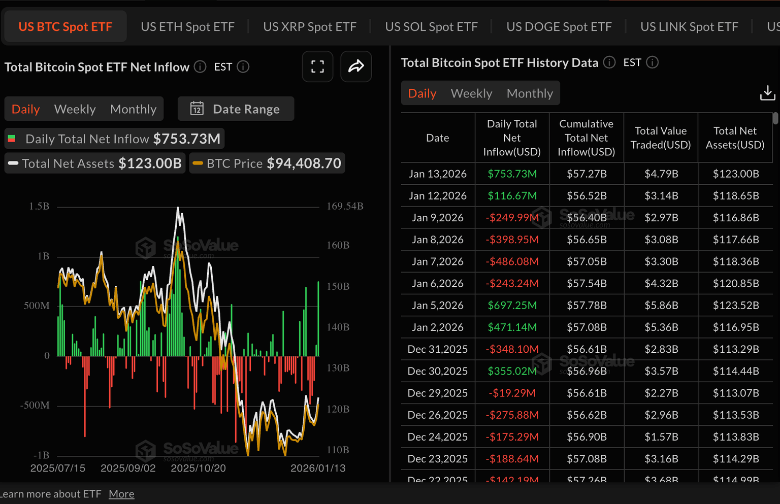 Los fondos cotizados en bolsa (ETF) de Bitcoin al contado registraron la mayor entrada en un solo día de 753 millones de dólares desde octubre el martes. El aumento fue impulsado en gran medida por una mejora general en el sentimiento tras el informe de la Oficina de Estadísticas Laborales de Estados Unidos (BLS) sobre una inflación subyacente más suave de lo esperado.