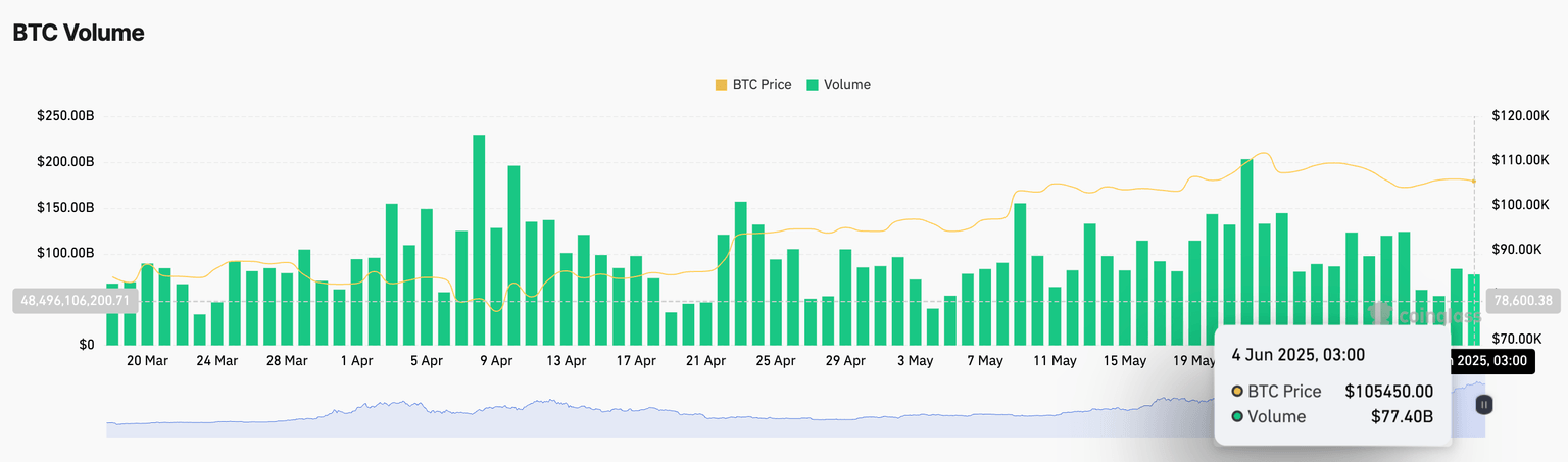 Una disminución posterior en el volumen de negociación a 77.40 mil millones de dólares desde 203.21 mil millones de dólares implica un interés decreciente de los operadores en BTC. Esto muestra que la participación en el mercado está disminuyendo, señalando indecisión.