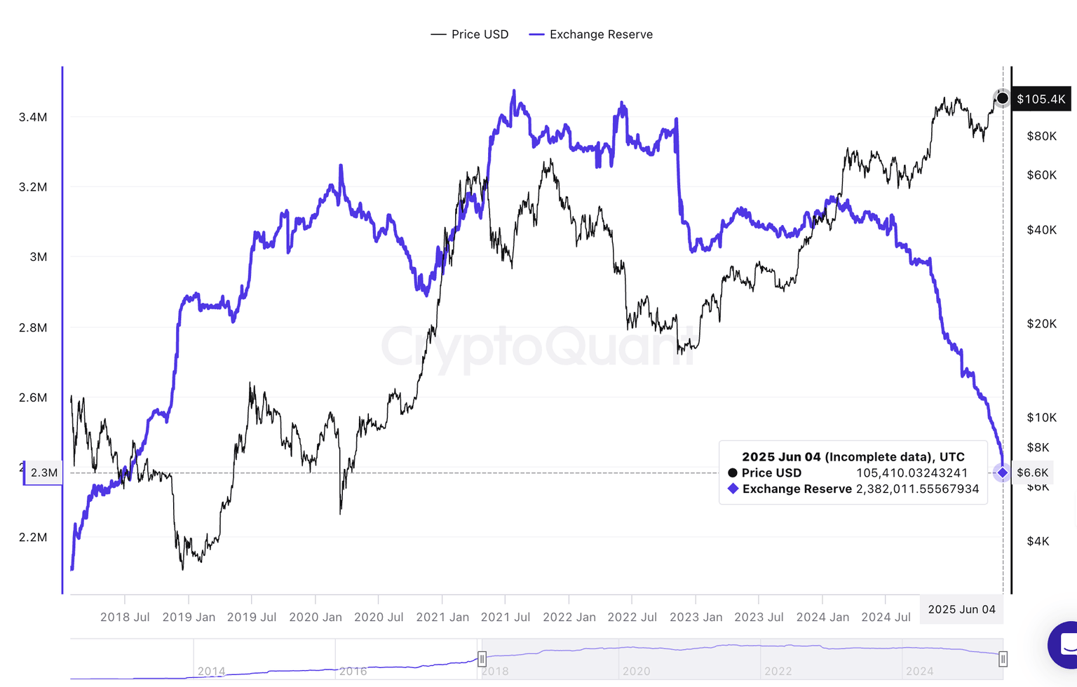 Las reservas de Bitcoin en intercambios, que se refieren al número de BTC disponibles en los intercambios, han continuado disminuyendo a un ritmo aún más rápido en las últimas semanas. Según el gráfico de datos en cadena de CryptoQuant mostrado a continuación, las reservas en intercambios se sitúan actualmente ligeramente por encima de 2.38 millones de BTC, lo que representa una caída del 13.5% desde 2.75 millones de BTC el 1 de enero de 2024, y una disminución del 23.5% desde 3.11 millones de BTC hace un año.
