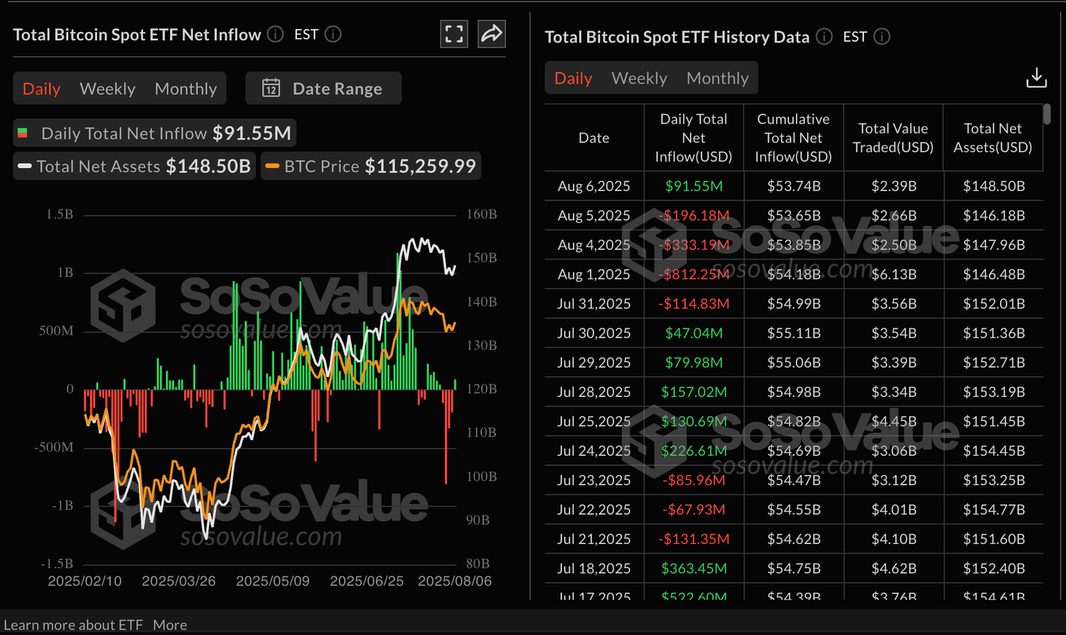 Estadísticas de ETFs de Bitcoin al contado | Fuente: SoSoValue
