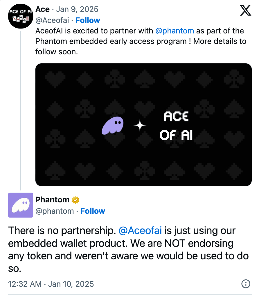 Phantom luego eliminó su respuesta, afirmando que Ace of AI solo estaba utilizando su servicio de billetera integrada y que no existía una asociación formal.
