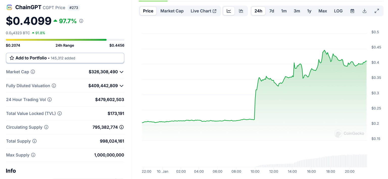 El precio de ChainGPT superó los 0.40$ al momento de la publicación, ya que la lista provocó un aumento del 97%, empujando su capitalización de mercado por encima de la marca de 320 millones de dólares.