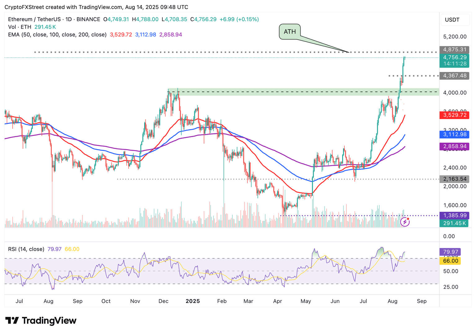 Ethereum está cotizando cerca de su máximo histórico por encima de 4.800$ y el máximo semanal en 4.788$. Los alcistas están en gran medida en control, respaldados por un RSI en aumento que actualmente se mantiene en territorio de sobrecompra en el gráfico diario.