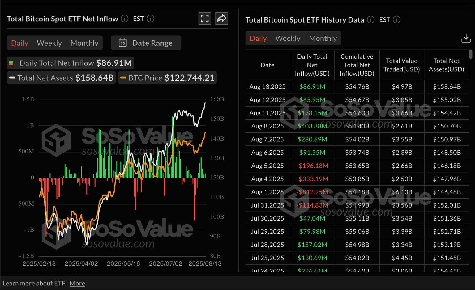 En cuanto a los ETFs de Bitcoin al contado, las entradas han sido constantes pero significativamente más bajas que los niveles vistos antes de que el precio alcanzara el anterior máximo histórico de 123.218$ a mediados de julio. Los datos de SoSoValue destacan aproximadamente 87 millones de dólares en entrada neta el miércoles, ligeramente por encima de la entrada de 66 millones de dólares del martes.