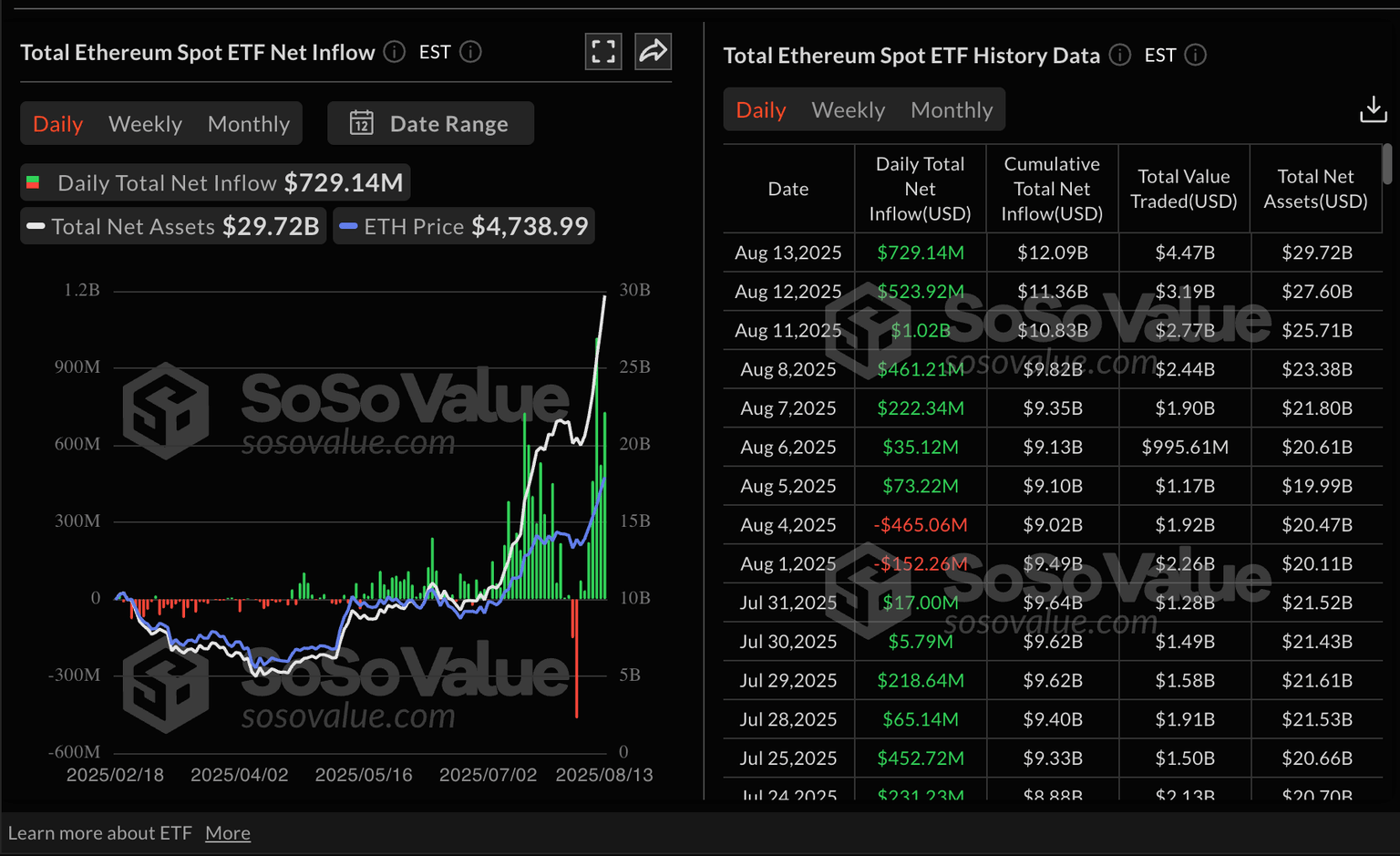 Los ETFs de Ethereum al contado listados en EE.UU. continúan superando a los ETFs de Bitcoin al contado. Según los datos de SoSoValue, los ETFs de ETH al contado vieron un total de 729 millones de dólares en entradas netas el miércoles, en comparación con los 524 millones de dólares registrados el martes.