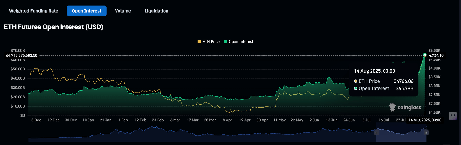 El aumento constante en la demanda especulativa, tanto de inversores institucionales como minoristas, refuerza la perspectiva alcista de Ethereum. Un breakout por encima de su máximo histórico podría aumentar el interés en ETH, especialmente con el Interés Abierto (OI) de futuros acelerándose a 66.000 millones de dólares el jueves.