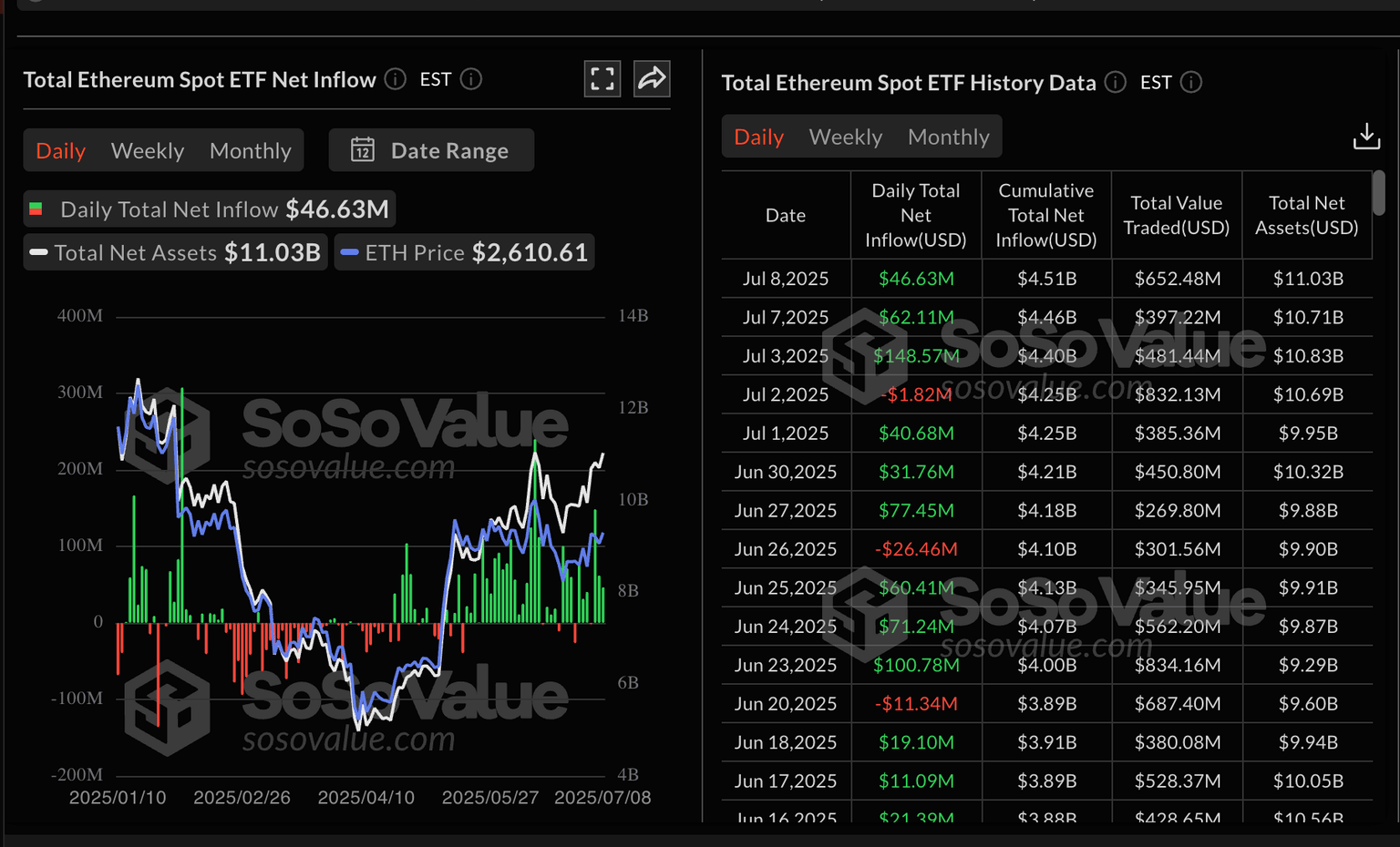 En cuanto a los ETFs de Ethereum al contado, el volumen total de entrada neta diaria alcanzó aproximadamente 47 millones de dólares el martes, extendiendo la racha alcista. El total acumulado de entrada neta se sitúa actualmente en 4.51 mil millones de dólares, con un total de 11.03 mil millones de dólares en activos netos.