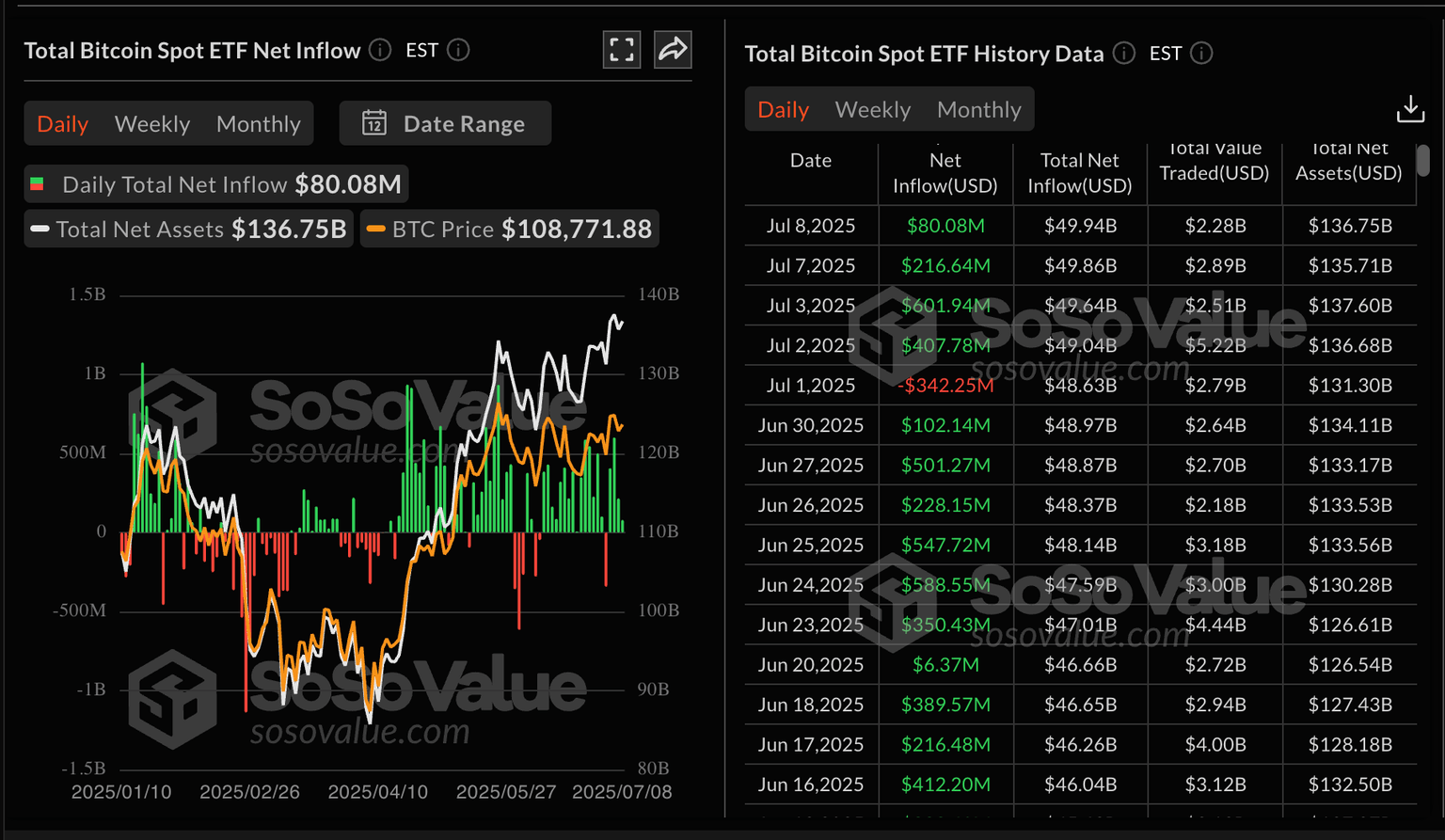El interés institucional en los Fondos Cotizados en Bolsa (ETF) de Bitcoin al contado se mantiene estable. Sin embargo, hay una notable caída en el volumen de entrada neto diario, con aproximadamente 80 millones de dólares registrados el martes. Este es el más bajo en cuatro días, siendo el más alto los 602 millones de dólares publicados el 3 de julio.